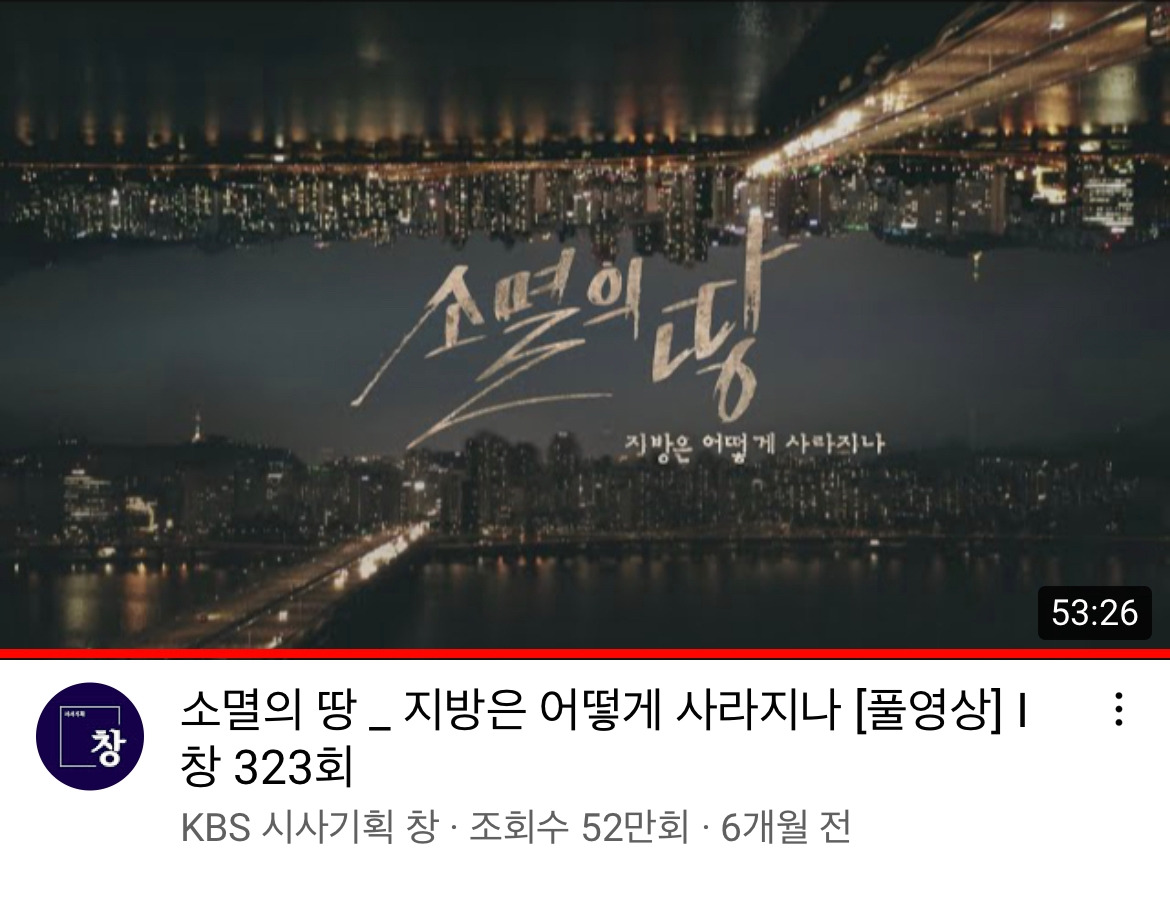 [관찰대상] #KBS #시사기획창 에서 한 다큐멘터리를 봤다. https://youtu.be/rJi-lM36RdU '소멸의 땅' 지방은 어떻게 사라지나 라는 제목의 #다큐멘터리 였고, Youtube 조회수는 52만 정도인 영상이었다.