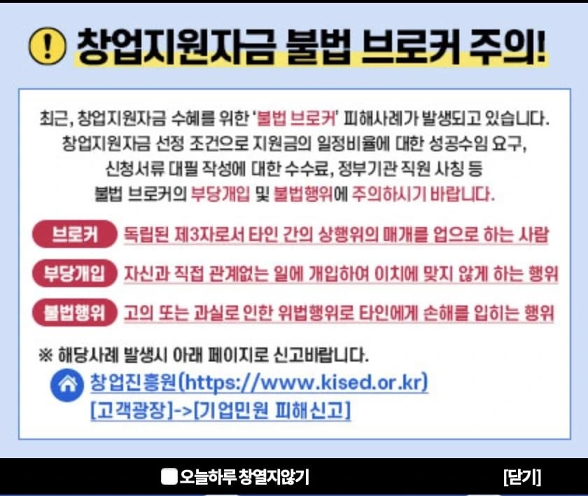 올해도 여지없이 '창업지원자금 불법 브로커'를 주의하라는 공고문이 K-startup 홈페이지에 떴다. 이제는 지겨울정도로 오래된 연례행사다. 저런 공문 띄운다고 쉽게 달라지지 않는다. (개선방안은 하단에 있다)