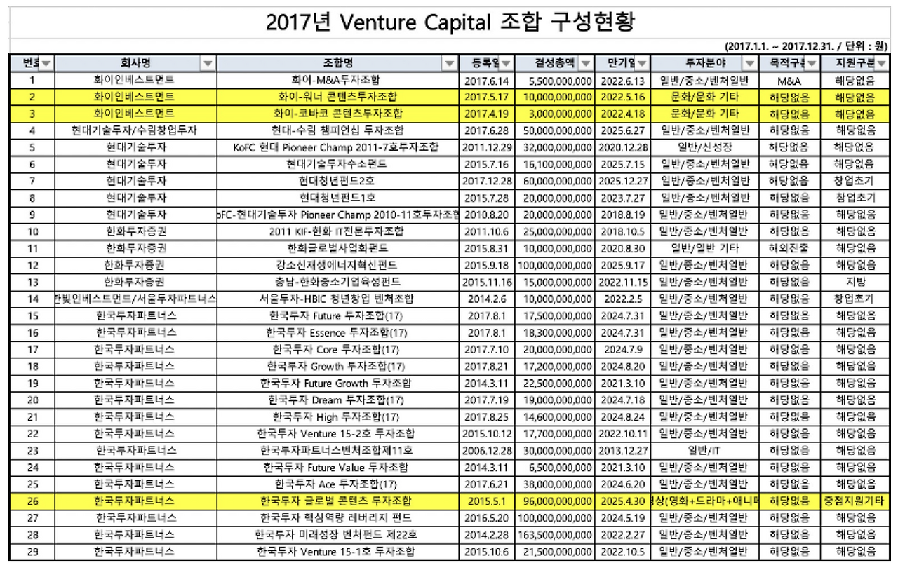 위에서도 언급했듯, 벤처투자조합은 다양한 목적을 갖고 5년 내지 10년간 조합을 운영하면서 기업 발굴, 투자회수 등의 투자금 운용을 진행하기 때문에, 목적에 맞는 기업발굴이 이들의 관심사이다. 아래의 2017년 VC조합 구성현황표에는 다양한 창업투자사들의 벤처펀드 운용현황이 나타나있다. 여기서 우리가 알아야 할 점은 ‘콘텐츠 투자조합’이라고 써있는 펀드를 운용하는 VC에 ‘반도체기술’을 가진 스타트업이 찾아가면, 그닥 관심을 받지 못한다는 것이다.