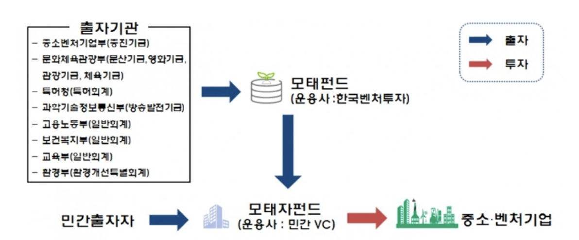 ‘돈의 흐름’은 모태펀드에서 시작된다. 물론, 그 전에 우리가 낸 세금이 기획재정부에서 각 부처로 배분되고, 각 부처의 투자담당부서가 모태펀드에 배정될 예산을 조율한다. 모태펀드를 조성하면, 모태펀드를 운용하는 운용사(주로 한국벤처투자(주))는 ‘자펀드’로 쪼개는 기획을 한다. 이때, ‘자펀드’는 각 출자기관(이라고 쓰고, ‘정부부처’라고 읽는다)의 성향에 상당한 영향을 받는다.