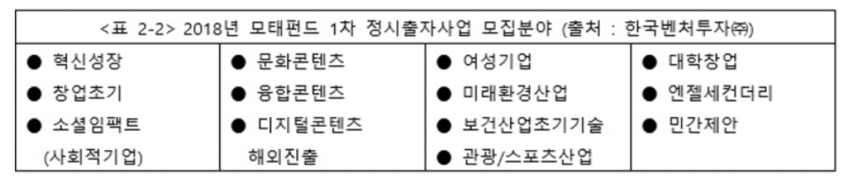 한국벤처투자(주)에서 운영하는 모태펀드는 우리나라 민간 벤처투자의 ‘마중물’ 역할로서, 2021년 현재 △스마트대한민국 △스케일업 △지역뉴딜 △청년창업 △M&A △소재부품장비 등 정책 목적에 따라 9개 유형의 자펀드를 구성해 출자하고 있다. 아래의 표를 보면 알 수 있듯, 2018년의 경우 13개 분야로 나누어 ‘자펀드 운용사(즉, VC)’를 선정했었다. 시대와 기술발전의 흐름에 따라서 투자분야가 추가되기도 하고, 사라지기도 한다. 너무 시대의 흐름에 민감하게 사업아이템을 바꿀 필요는 없지만, 모태펀드의 자펀드(즉, 출자사업 분야) 운용사(VC)가 관심있을 사업아이템인지 스스로 생각해보는것도 사업가로서 필요한 일이다. ‘시대의 흐름’에 맞지 않는 사업아이템을 한다면, 누가 투자하고 싶을까?