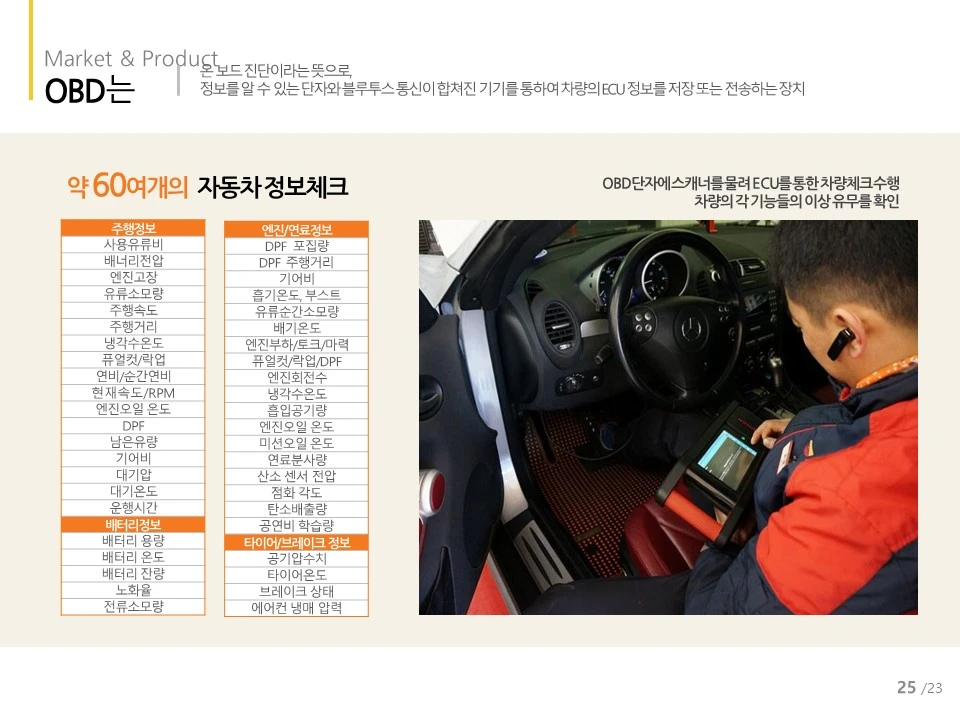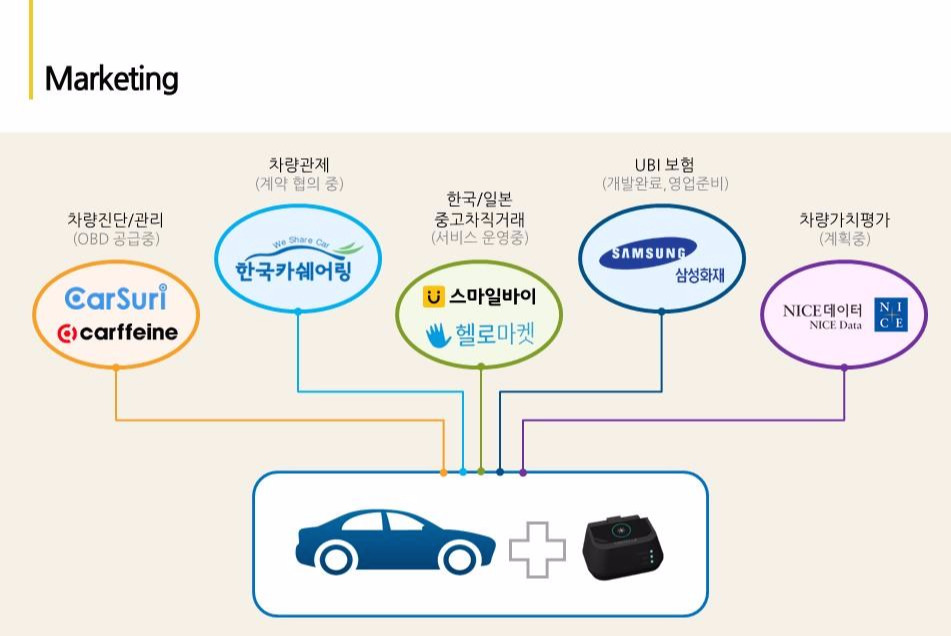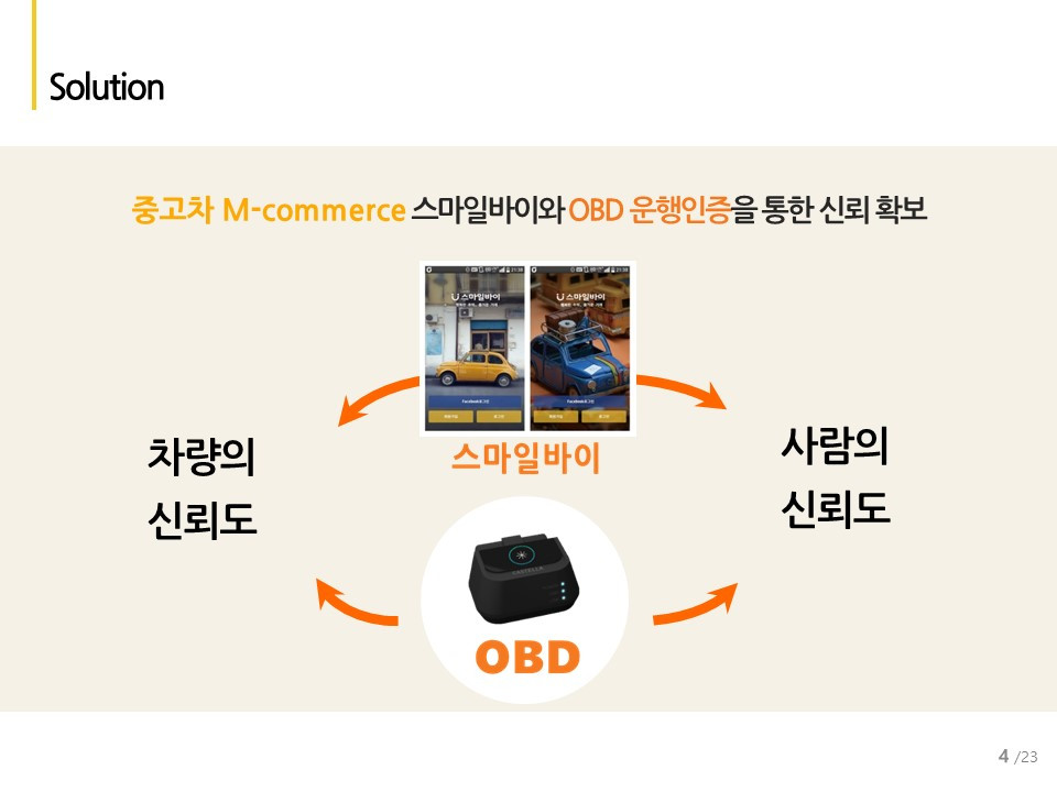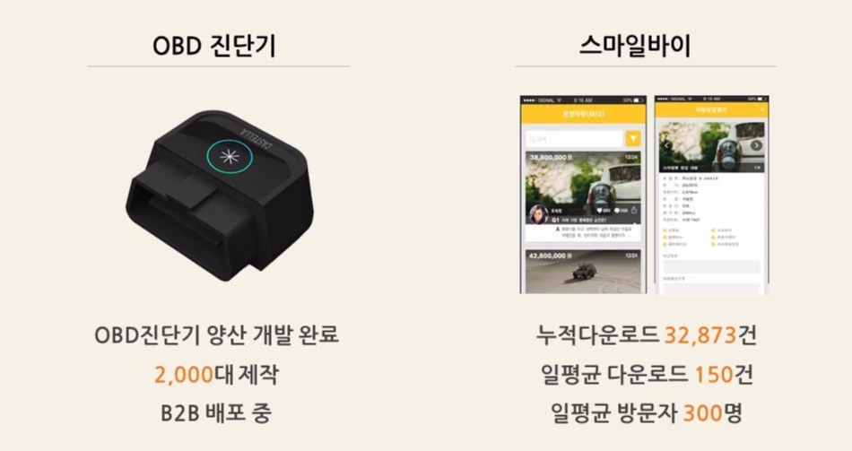 - 오토팩토리는 현재 중고차거래 어플리케이션인 '스마일바이'를 보유하고 있으며, 스마일바이에서 거래되고 있는 거래량이 월 5억원 가까이 되고 있다. 이미 3만명이 넘고 있는 스마일바이의 열성유저들을 대상으로 부분적인 유료화를 진행하면서, OBD 스캐너를 무료로 배포(또는 무료임대)하는 것을 구상중이다. 중고차량(Old car)의 가액(Value)을 지켜주는(Defence) 핵심 매개체로서 OBD를 제공함으로서, 중고차를 거래하는 소비자들에게 '신뢰'라는 진정한 가치를 제공하고자 한다.