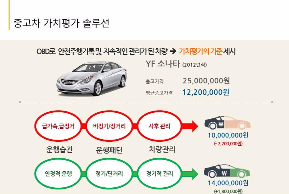 보통, 연식, 주행거리, 외관평가로 중고자동차의 가격을 평가 하는데, 연식과 주행거리, 외관평가만으로는 정확한 가치산정이 어렵다. 그래서, 엔진의 성능과 부품의 마모 등을 평가요소에 추가하여 보다 객관적인 중고차 가치평가가 가능하도록 하는 서비스를 개발중이다.