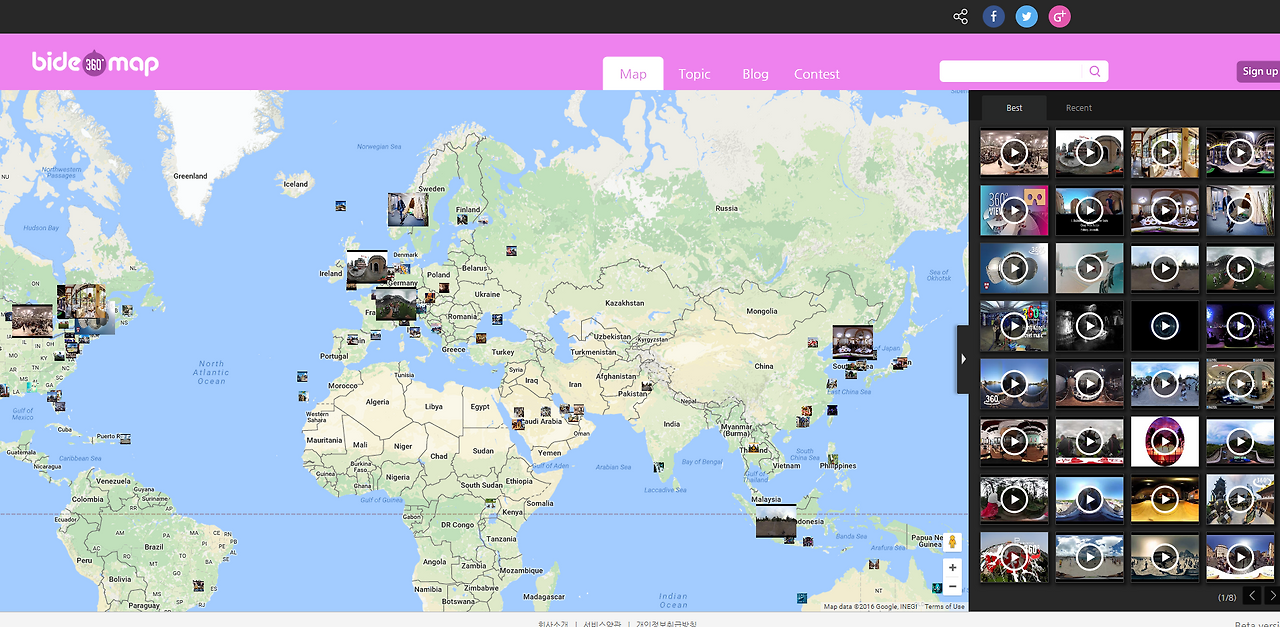 비디오맵 (bideomap.com) 서비스는 급증하는 360도 영상컨텐츠를 효과적으로 제공하기 위한 플랫폼 서비스입니다. 일종의 새로운 SNS형태라고 할 수도 있습니다. 사용자가 자신의 360도 컨텐츠를 올리거나, 유투브나 유쿠 등에 올린 컨텐츠를 링크만 걸어줘도 됩니다. 예를 들어 엄정한 변리사님이 지난 일요일에 에버렌드에서 촬영한 360도 동영상을 유투브에 올렸는데, 이를 비디오맵의 지도에 링크하면 지역별로 영상을 저장하고 쉽게 공유할 수 있습니다.