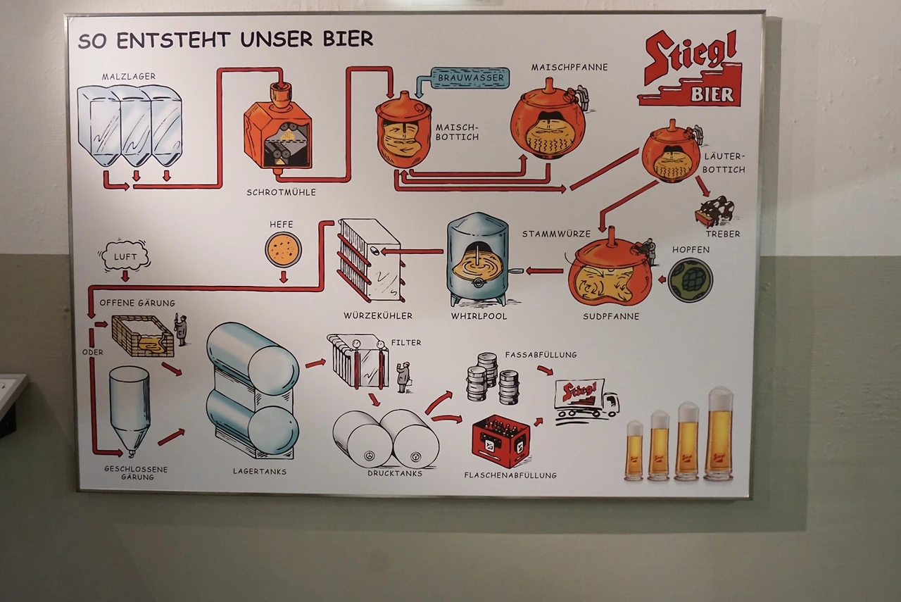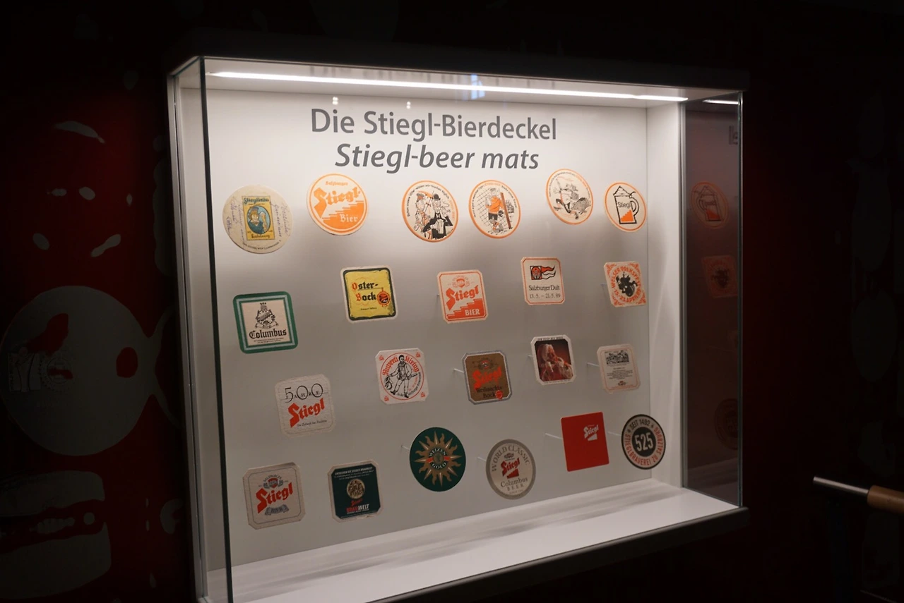 이어진 전시관은 양조 시설이었다. 현재 사용하고 있는 시설이 아닌 아주 오랜 시절 집에서 가내 수공업으로 맥주를 생산하고 시절을 보여준다. 간결한 그림과 설명으로 각각의 시설에 대해 설명해주고 있어 혼자서도 충분히 재밌게 관람할 수 있었다. 또한, 스티글 양조장이 어떤 과정을 통해 현재에 이르게 되었는지 성장과정을 보여준다. 마지막에는 스티글 양조장이 잘츠부르크 사람들의 일상에 어떻게, 얼마나 녹아들어 있는지 보여준다.