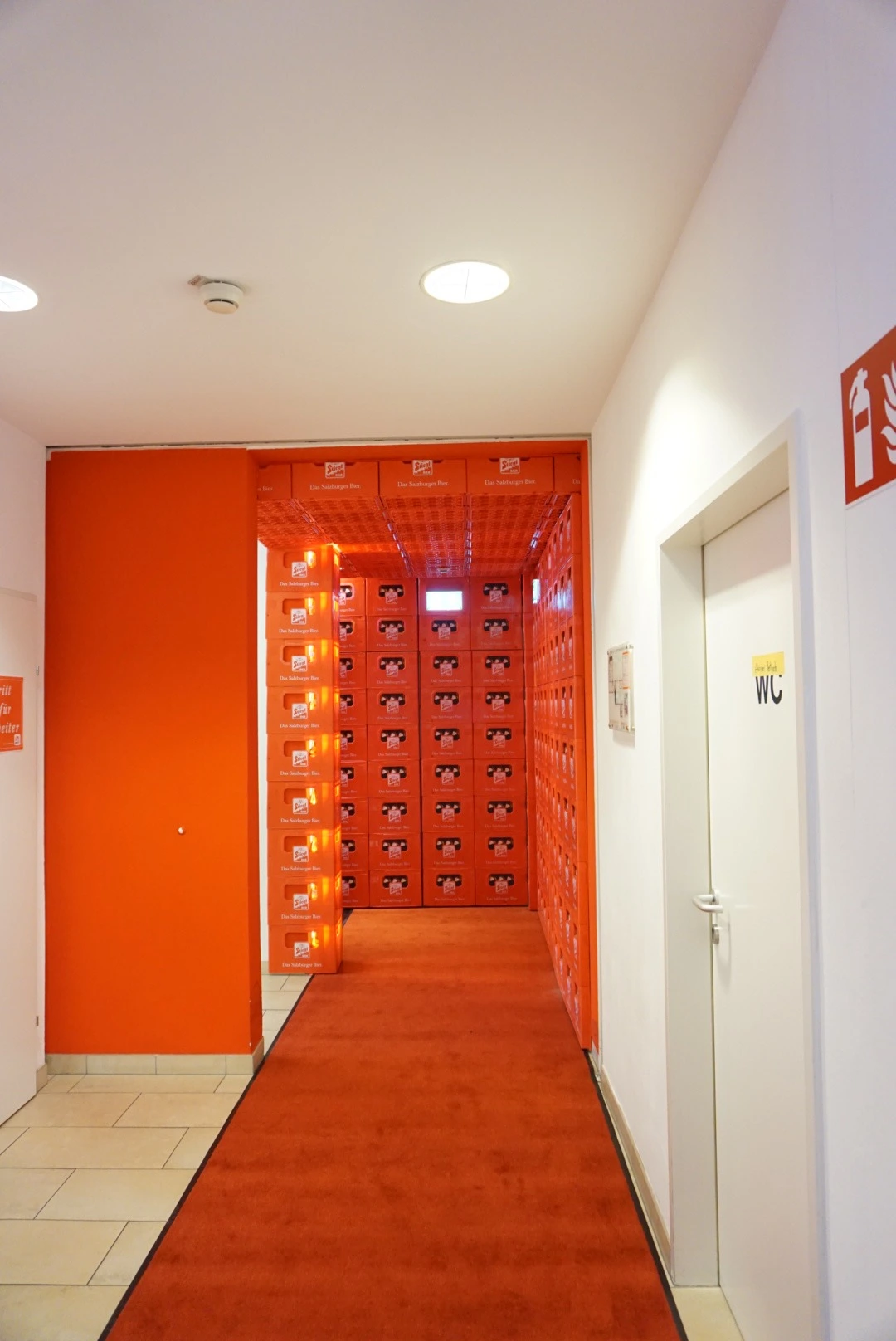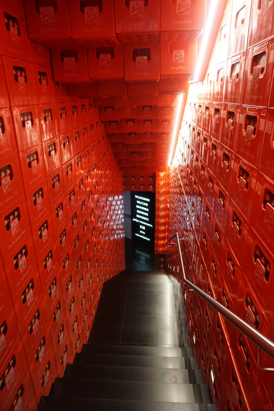 스티글 양조장 안의 박물관으로 가는 입구는 정말 독특했다. 새빨간 스티글 맥주 상자로 계단 옆과 위를 가득 채웠는데 뭔가 인스타 감성 느낌도 나고, 빨간 계단이 로고인 스티글과 잘 어울린다고 생각했다. 계단을 내려가면 대형 스크린에서 맥주 생산 과정을 계속해서 상영해준다. 스크린의 주변으로는 맥주 생산에 사용되는 재료들을 전시하고 있다.