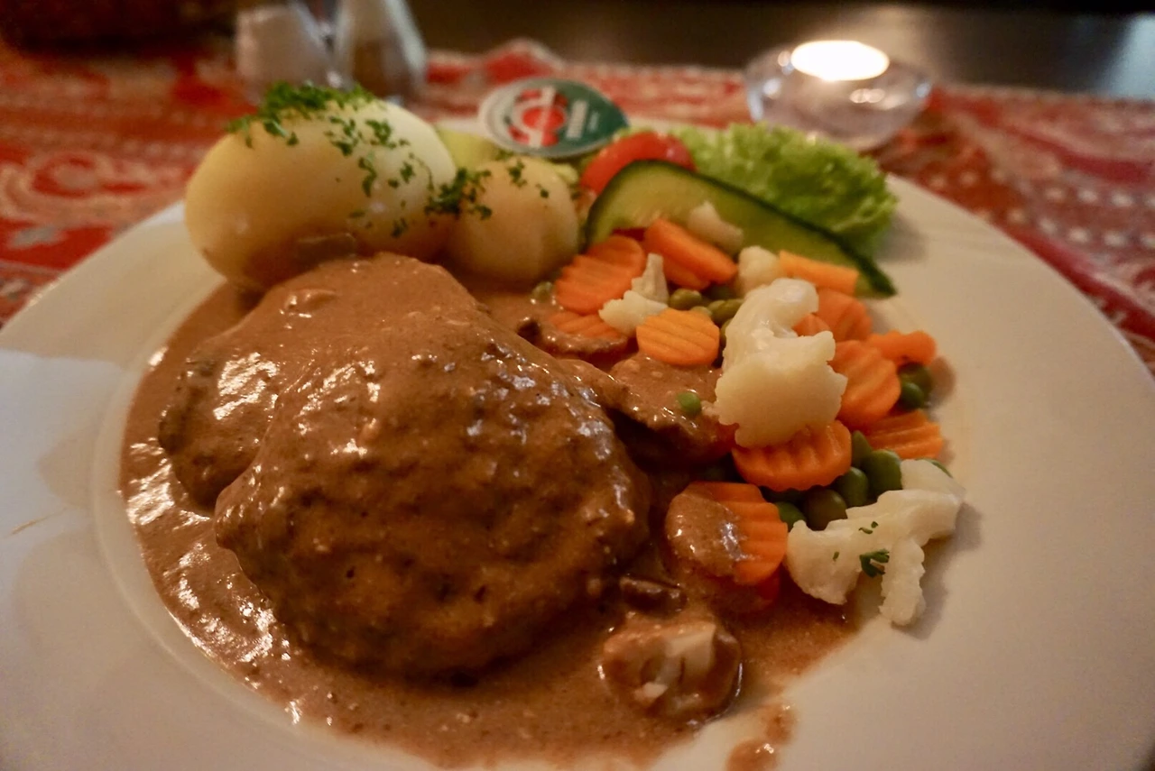 주문한 음식이 나왔다. 겉으로 보기에는 함박스테이크와 비슷해보였다. 소스는 크리미한 느낌이 강했고, 감자와 각종 야채들이 함께 나왔다. 이번에도 베리류의 잼이 함께 나왔다. 스튜와는 다른 느낌으로 정말 맛있었다. 잘게 다진 스테이크가 먹기에도 편했다.