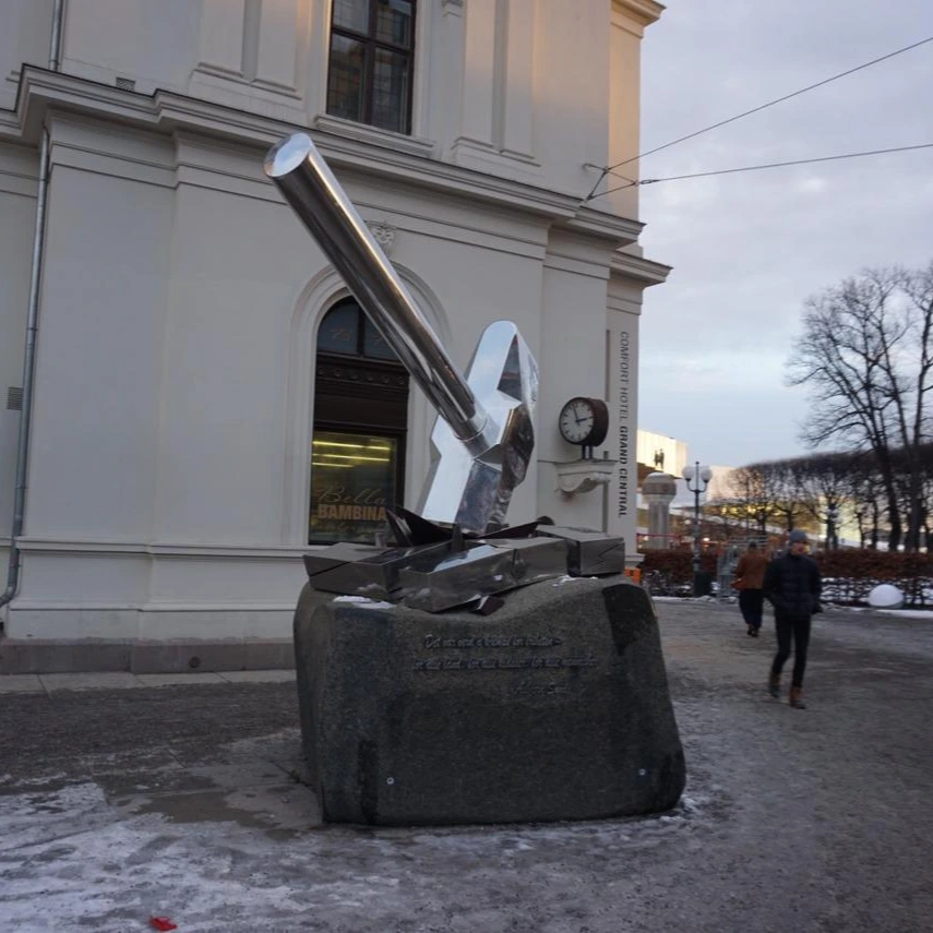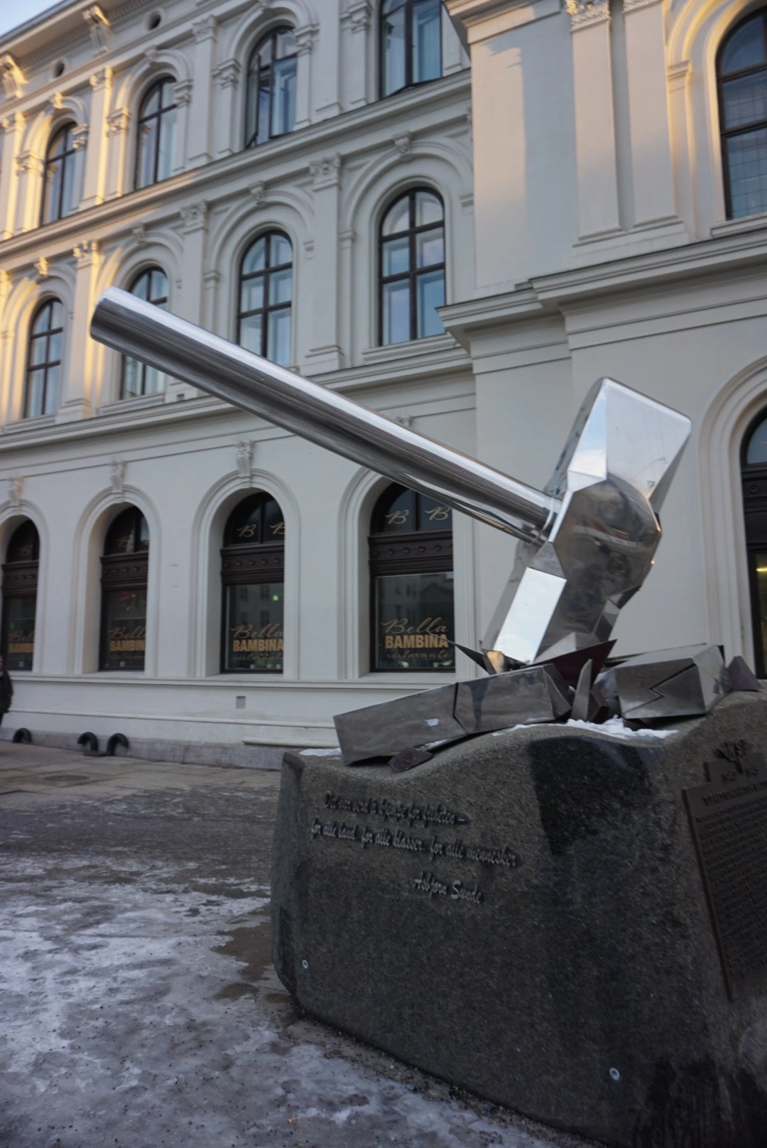 토르의 흔적을 찾기 위해 가장 먼저 방문한 곳은 오슬로 중앙역 앞 광장이었다. 광장에는 거대한 호랑이 동상도 있었지만 내 시선을 끈 것은 거대한 망치였다. 당연히 토르의 묠니르라고 생각했다. 하지만 아쉽게도 이 망치는 묠니르가 아니었다. 이 동상은 제 2차대전 시기에 활동한 노르웨이의 반나치즘 활동가들을 기리기 위한 것이라고 한다. 동상을 자세히 보니 나치의 하켄크로이츠 문양을 망치로 부수고 있는 모양이었다. 토르를 상징하는 것은 아니었지만 거대한 망치라는 점에서 토르가 떠오를 수 밖에 없었던 것 같다. 아쉬움을 뒤로 하고 진짜 토르가 있는 오슬로 시청으로 향했다.