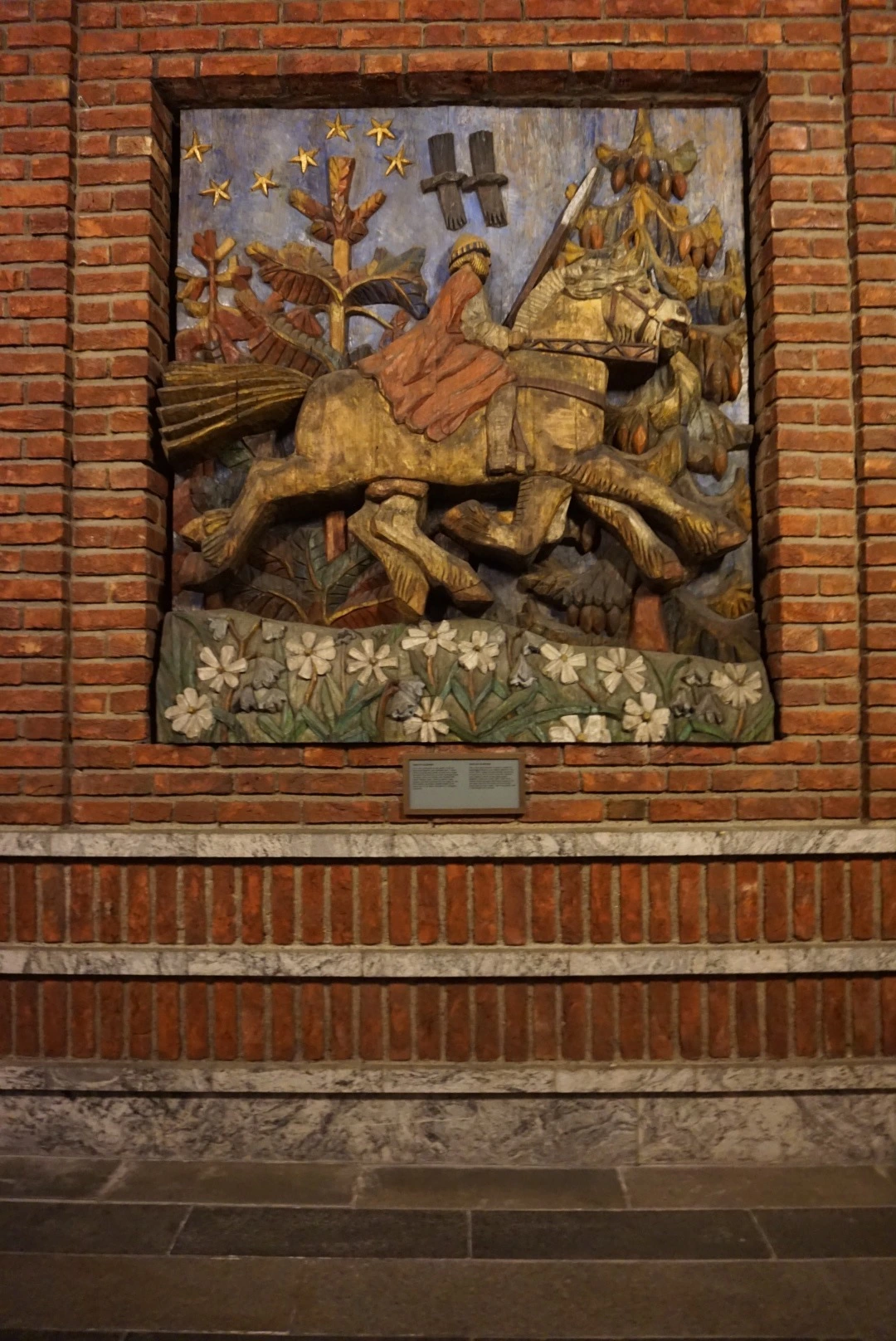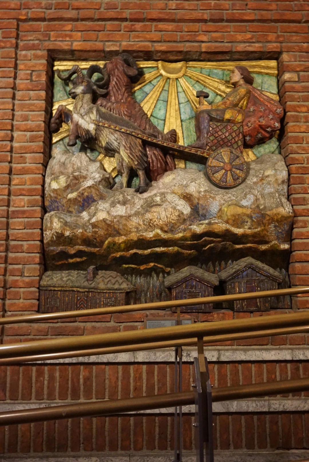 오슬로 시청은 시청보다는 관광지, 박물관의 느낌이었다. 늦은 시간에 방문해 내부는 관람할 수 없었지만 토르는 찾을 수 있었다. 오슬로 시청 1층은 바깥 벽을 따라서 북유럽 신화의 내용을 주제로 한 작품이 전시되어 있었다. 내가 찾던 토르를 포함하여 오딘, 펜니르, 라그나로크, 이그드라실 등 북유럽 신화 속 내용이 조각되어 있었다. 작품 속 토르는 염소가 끄는 자신의 마차를 타고 한 손에는 유명한 그의 망치, 묠니르를 쥐고 있었다. 생각보다 묠니르가 작았지만 북유럽에서 토르를 만났다는 사실이 반가웠다.