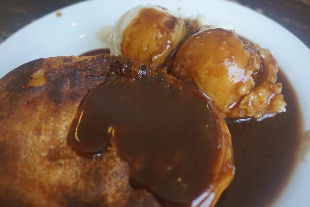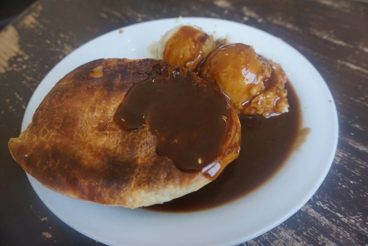 안에 들어가 주문을 기다리며 메뉴를 보니 전통적인 방식의 쇠고기 파이가 있었고, 치킨, 버섯, 양고기 등이 들어가는 다양한 종류의 퓨전 파이가 있었다. 그리고 모든 메뉴에 기본적으로 으깬 감자로 만든 매쉬 포테이토가 두 스쿱씩 제공되었다. 전통을 자랑하는 식당에 온만큼 전통적인 쇠고기 파이를 주문했다. 파이 위에 올라가는 소스는 두 종류 중 선택할 수 있었다. 전통적인 소스는 파슬리를 기반으로 한 파슬리 소스이고, 다른 소스는 그레이비소스를 선택할 수도 있었다. 전통적인 소스는 파슬리 소스라지만, 초록색 소스의 비주얼이 뭔가 끌리지 않아 그레이비소스를 선택했다.