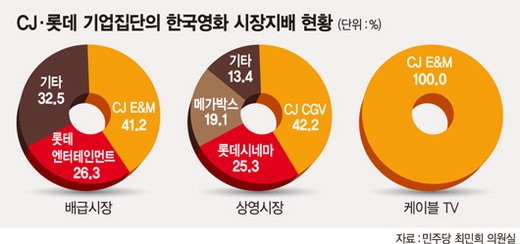 스크린 독과점의 가장 큰 요인으로 ‘수직계열화’가 꼽히고 있다. 영화 제작사와 배급사,상영관이 하나의 기업에서 진행되는 방식을 문제로 삼는 것이다. 이를테면 CJ 엔터테인먼트가 투자,제작한 영화를 CJ 엔터테인먼트의 계열사 CJ CGV에 직접 배급해서 상영하는 경우다. 롯데 엔터테인먼트의 경우도 롯데 시네마를 계열로 두고 있어 같은 예에 해당한다.