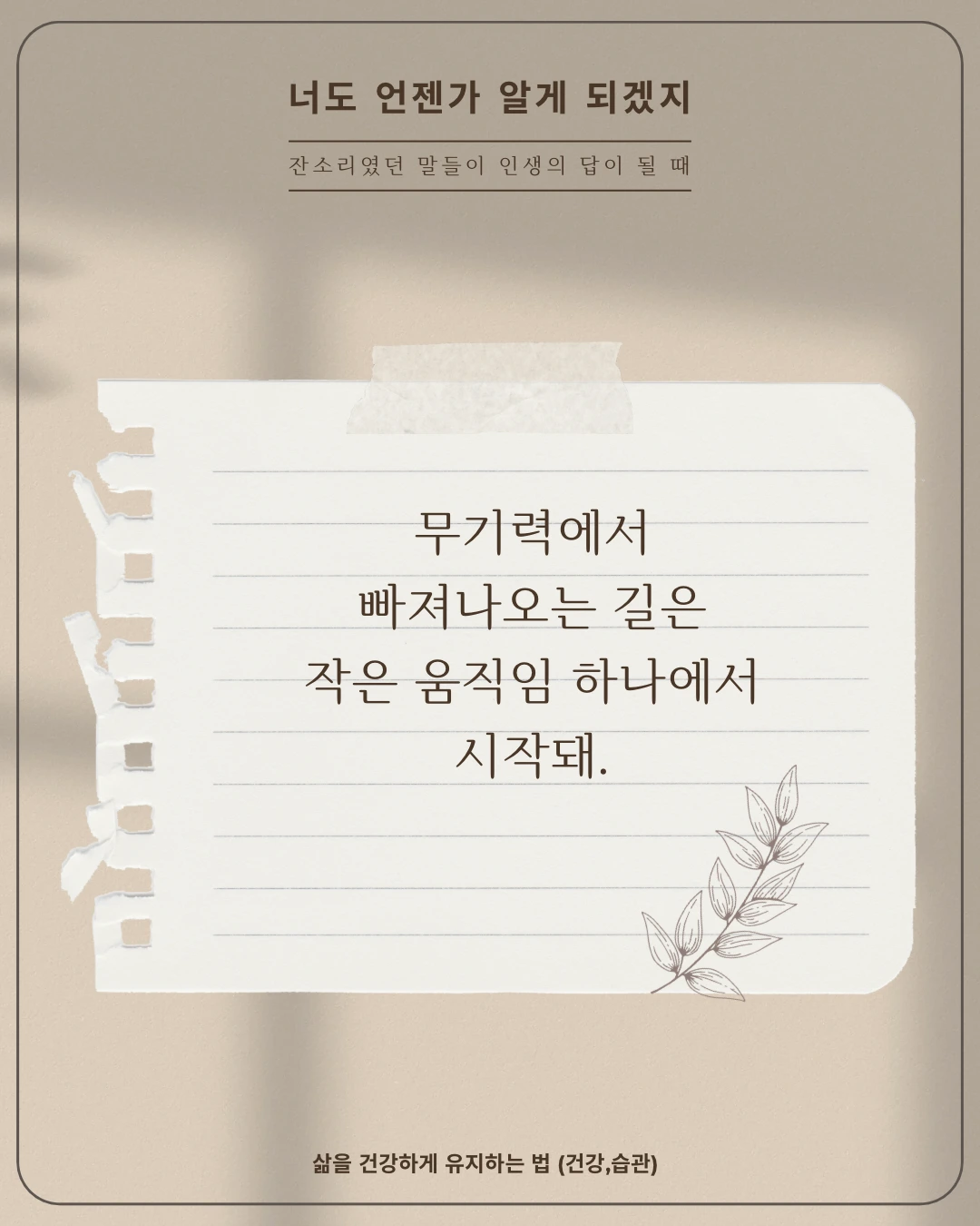 무기력은 가만히 두면, 점점 더 나를 눌러와. 헤어 나올 수 없는 늪에 빠져버리지. 벗어나고 싶다면, 작은 움직임 하나부터 시작해야 해. 생각을 정리하려 하지 않아도 괜찮아. 그냥 몸을 조금만 움직이면 돼.