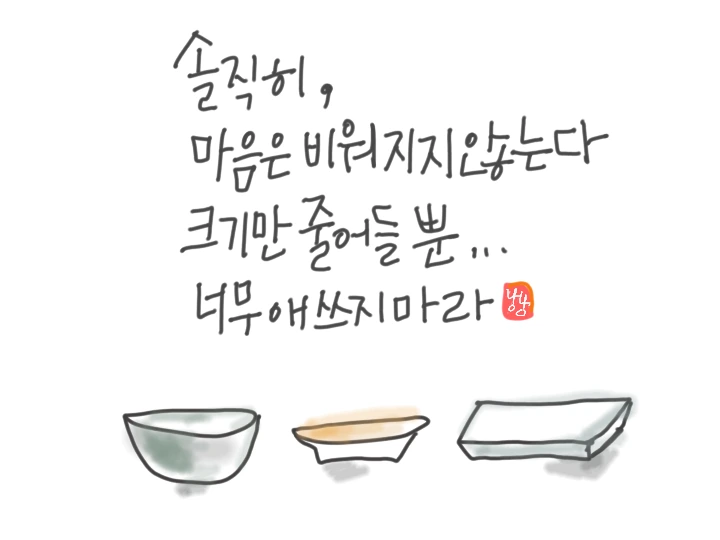 책에서는 맨날비우라고 하지만 비우는 거 참 힘들잖아비워진 거 같지만비워진 거 아니잖아조금만 비우고또 그만큼 적당히 채우고그렇게 살면 안될까그만큼만