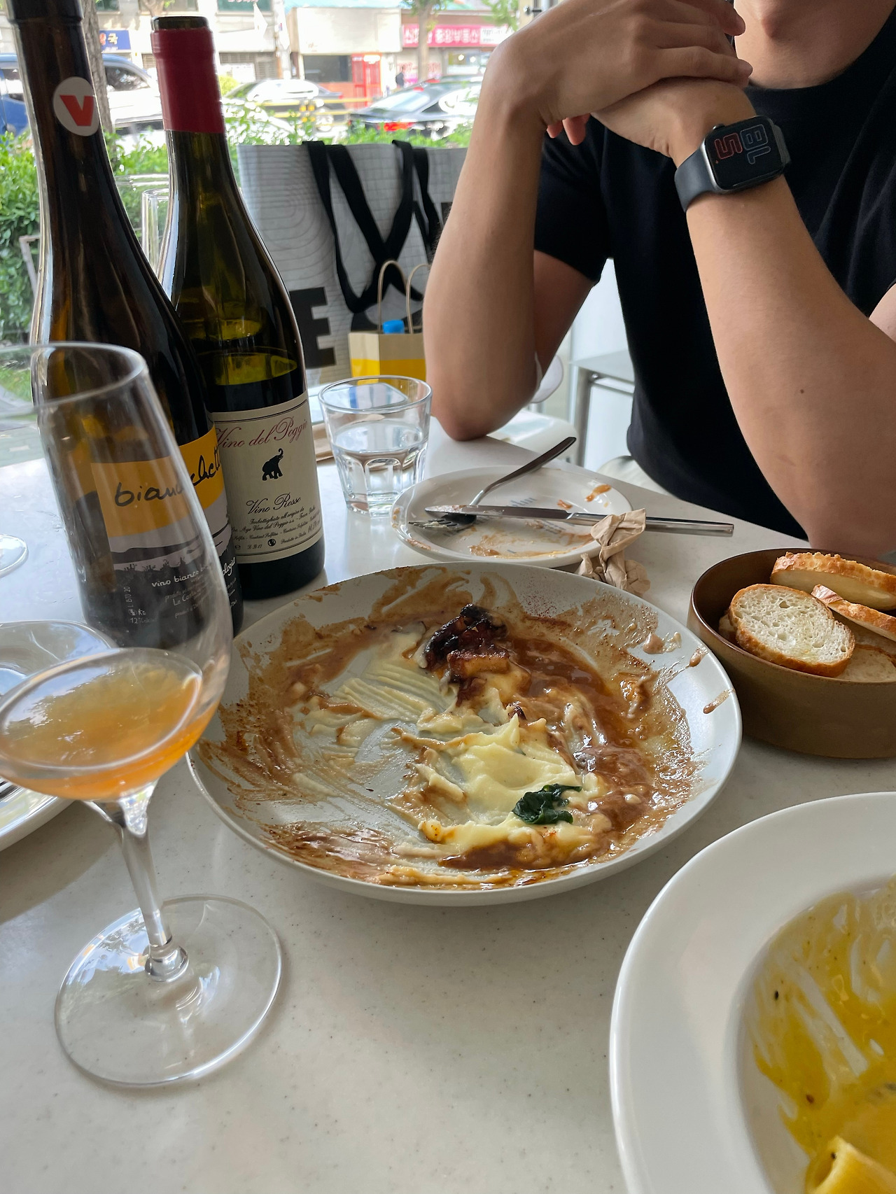 와인은? 내추럴 와인. 설명부터 예사롭지 않았다. 꼬리꼬리함이 있다고 하셨는데, 진짜 딱. 내가 알던 와인과 달라. 잔을 코에 박고 향을 맡았다. 적응되지 않는 꼬릿함. 흘러가는 얘기에 금방 한 병을 비우고선 좀 더 특징 센 놈을 부탁했다. 이런 말 해도 되려나. 사장님께서 추천하시며 똥에 비유하셨다. 궁금증에 시키지 않을 수 없었지. 향을 맡고선 우리는 서로의 눈을 번갈아 보기 바빴다. 하지만 결코 맛없음에 의한 것이 아닌 새로움 때문이었다.