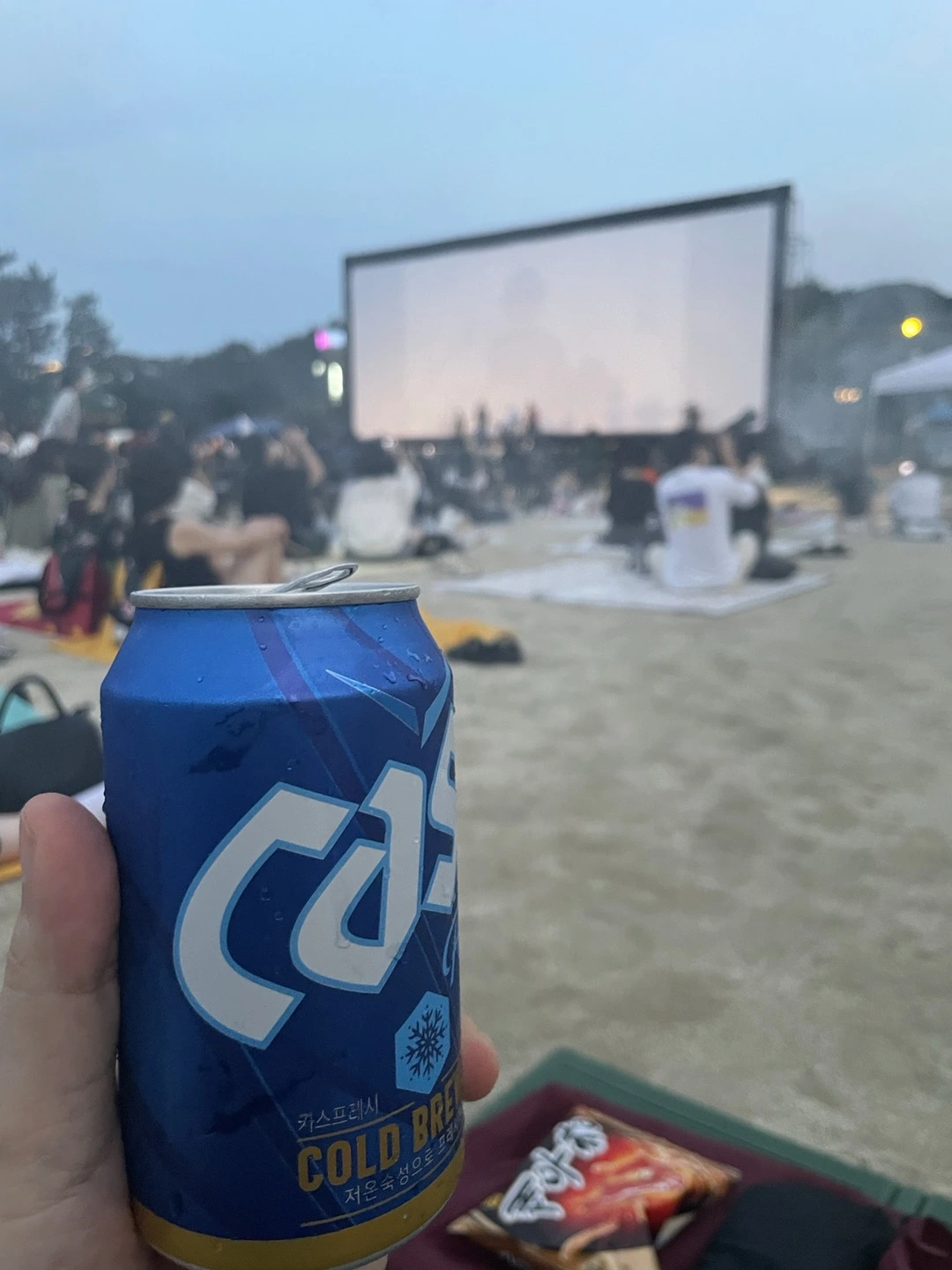 영화가 틀어질 때 즈음 해가 스르륵 저 산 너머로 넘어가려 한다. 그때면 사람들은 대부분 각기 자리를 잡는다. 누구는 의자에 앉고 또 누구는 삼삼오오 모여 돗자리를 편다. 그 돗자리 위엔 치킨과 맥주처럼 한강에서 즐길 법한 온갖 먹을거리가 함께 올려진다. 나도 맥주를 먹는다. 영화 하나가 끝날 때마다 화장실에 가곤 하지만 홀짝홀짝 마시는 그 찌릿찌릿함을 포기할 수 없는 노릇. 영화와 맥주. 차- 작정한 콤비다.