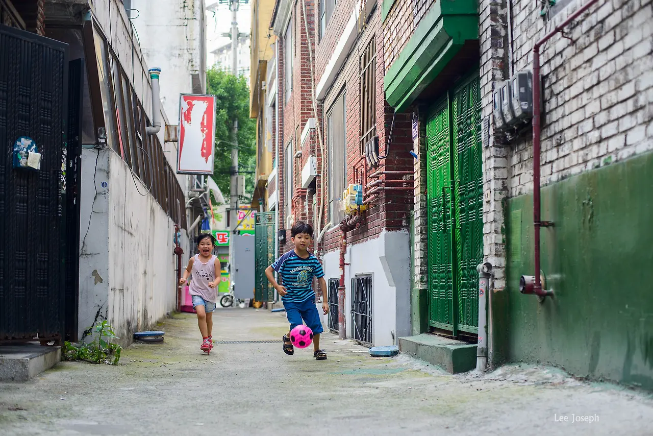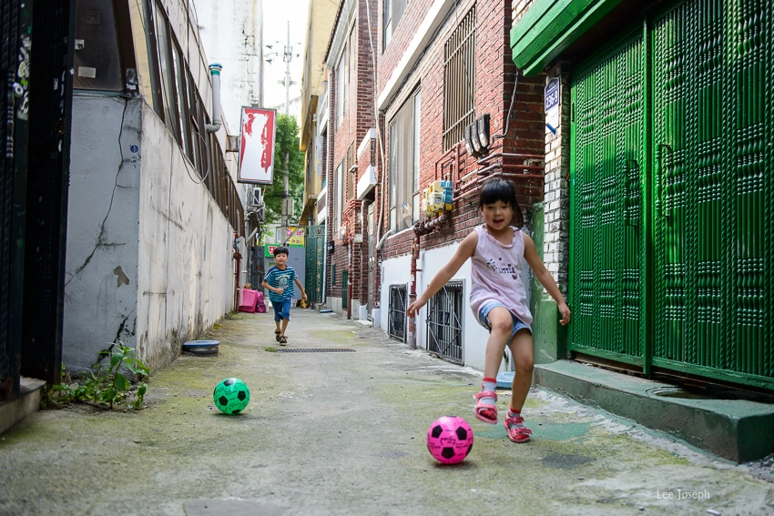 질 수 없다며 골목 저 너머까지 나도 뻥하고 공을 찹니다.
