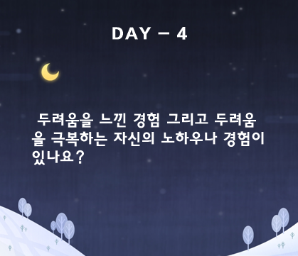 보름달 4일 차를 맞이하는 오늘, '나'와 '보름달 구성원' 에게 두려움을 극복하는 삶의 힘과 내면의 힘을 느끼게 해주는 하루가 되었으면 한다.