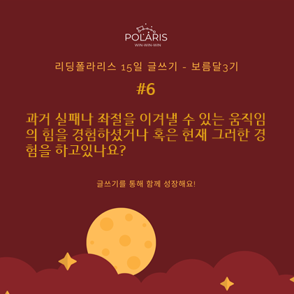 나는 보름달 3기를 통해서 '움직임'이라는 주제를 가지고 환경설정을 하였다. 15일 동안 무슨 큰 변화가 있겠냐만은 그래도 이번 일을 계기로 육체적, 정신적 건강을 위해서 달리고 뛰는 일을 멈추지 않을 것이다.