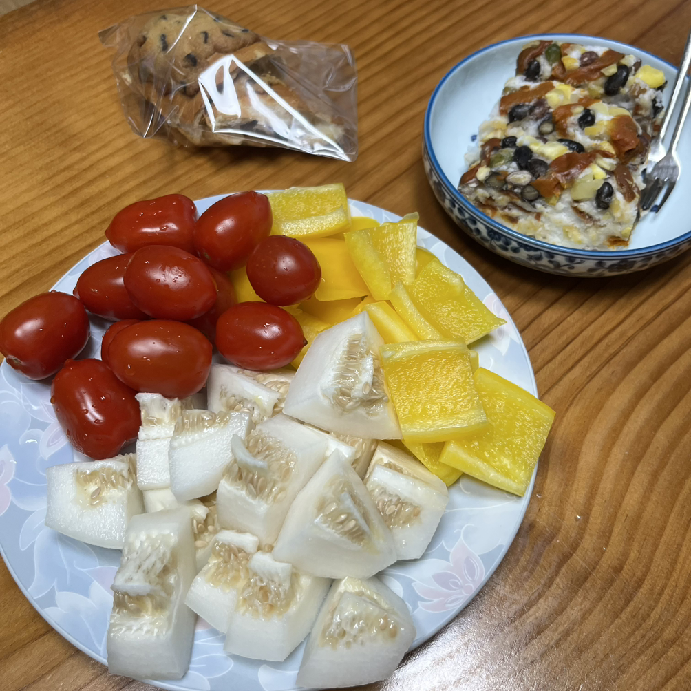 “간단히? 그럼 엄마도 간단하게 해치울까? 너 빵이랑 떡도 먹을래? 파프리카랑 방울토마토 해서?”