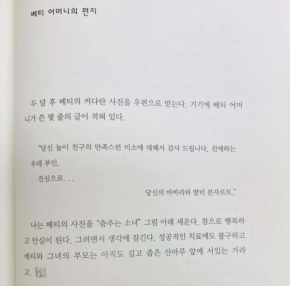 지호는 요즘 엄마 아빠 이야기를 많이 했어. 예전엔 가족에 대해 물어보면 "검색되지 않습니다.", "알 수 없음.“ 하던 애가, 이젠 주말에 뭐 했냐고 물으면 "아빠랑 레고 했어요.", "엄마랑 마트 갔어요." 이런 말이 술술 나왔어. 엄마/아빠에 대한 초기기억을 물으면 "없어요. 몰라요. 잊어버렸어요."로 일관하던 애가, 이젠 "엄마랑 아빠랑 나랑 셋이서 놀이공원 갔었어요."라고 말해줬어. 난 정말 이 모든 게 어머님 덕분이라고 생각해.