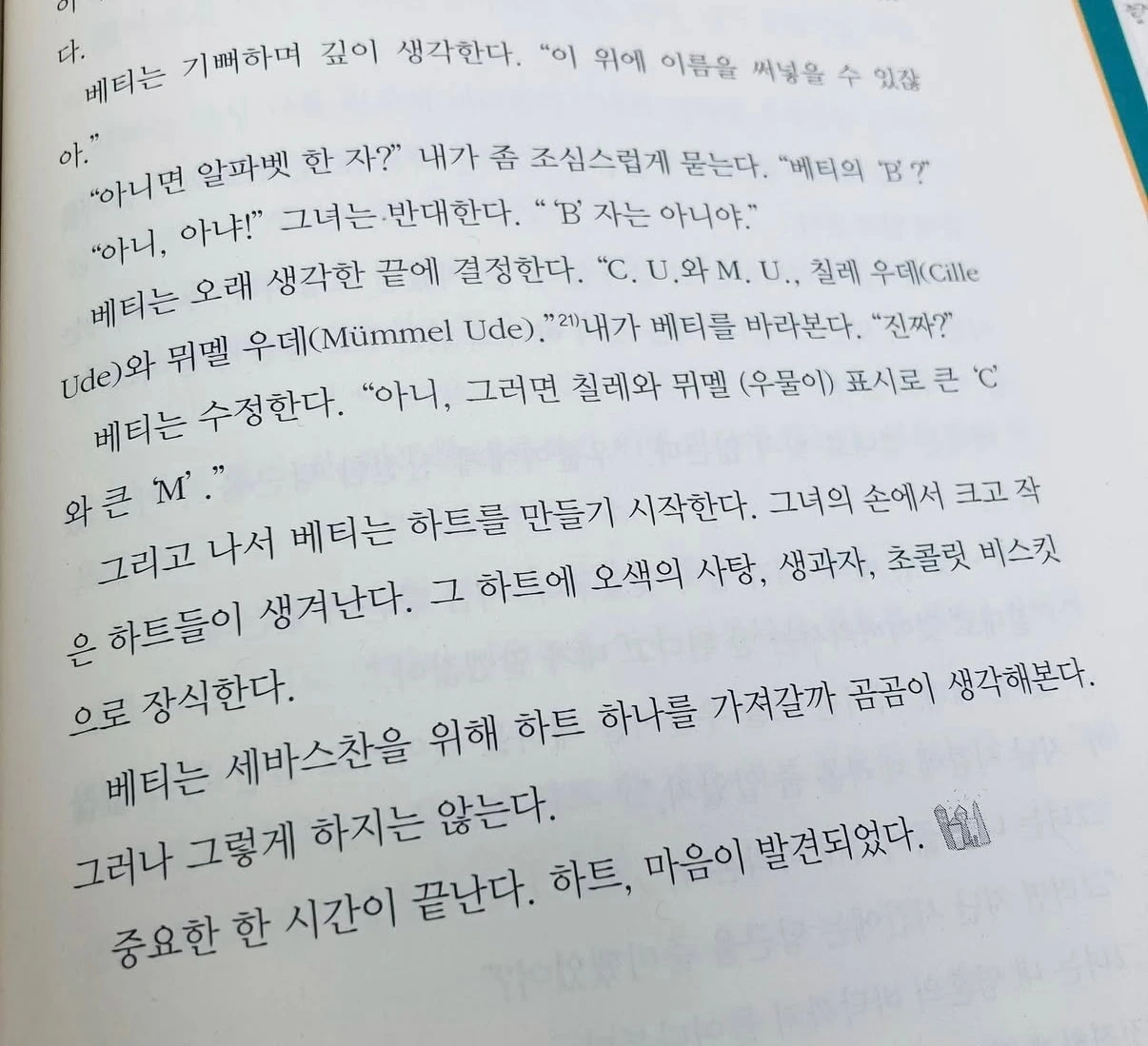 지난가을엔 종이에 바둑판을 그려놓고 룰도 없는 이상한 바둑게임을 열심히 했고, 겨울부턴 미로를 수십 장 그렸어. 미로엔 종종 바다가 등장했는데, 내가 바다를 알아볼 수 있게 색을 칠해달라고 부탁하면 늘 단호하게 거절했지. 자동차만 달릴 수 있던 미로에 봄부터 못된 외계인이 등장했고, 몇 주 후 친구들이 등장하고 바다가 색칠된 어느 날 나는 하트를 봤어.