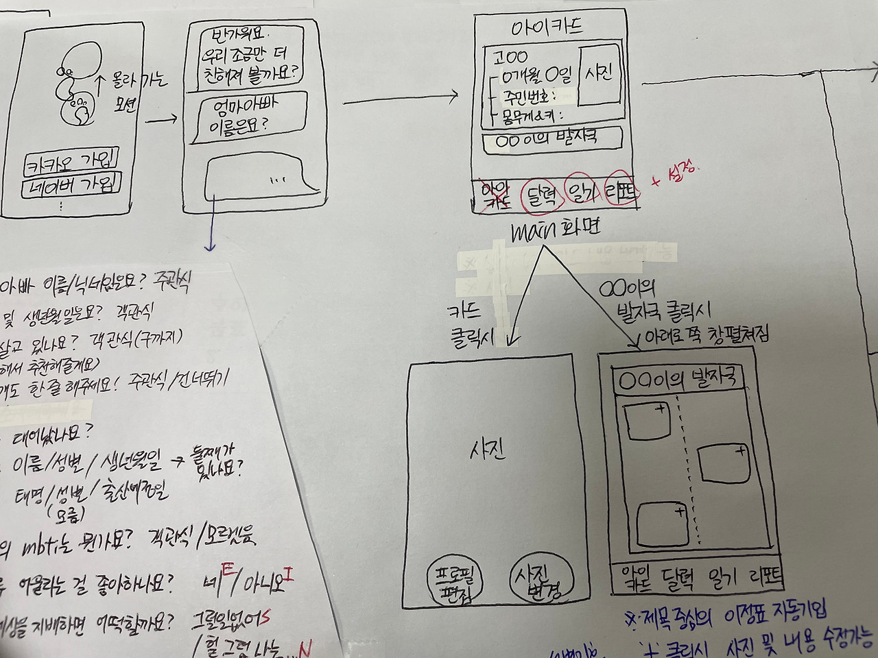 A4 용지 위의 낙서 같은 화면계획서를 보며 또 하나를 이뤘다는 생각에 설렘이 일었다. 실제 어플로 구현될 설계도를 보고 있으니 더 가슴이 벅차올랐다. 이게 진짜 어플로 나타난다니. 믿기지 않기도 하고 걱정도 되고. 하지만 중요한 건 완벽한 도구가 아니라, 내가 시작했다는 것.