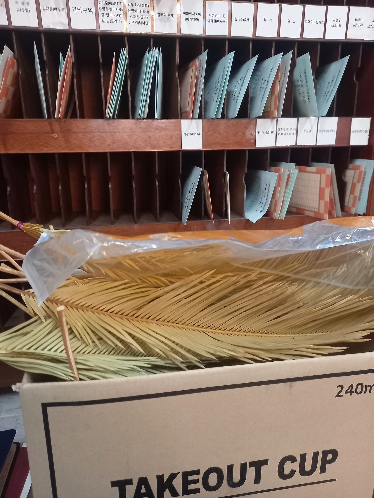 성공회 내동교회에 설 성찬례를 드리러 옴 일 년 동안 십자가에 매달린 예수 위에 걸어놓은 성지(聖枝)를 가져옴. 다음 주 수요일이 재의 수요일이라 요한 신부님이 성지를 태울 것이고 인생아, 기억하라. 너는 흙이니 흙으로 돌아갈 것memento mori이라고 말씀하실 것이기 때문이다.