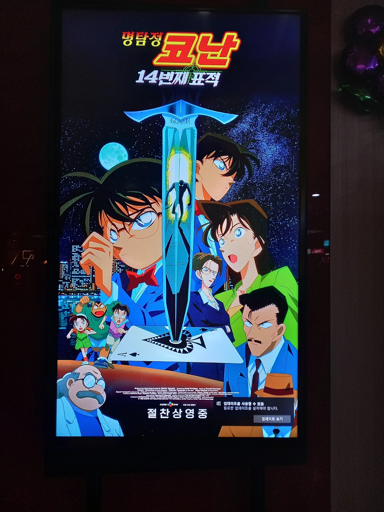 명탐정코난 14번째 표적을 보러 오다. 상영첫날에 예매했는데, 앞 좌석을 순식간에 예매한 분들을 생각해 보면 인기가 높은 만화이다. 시한장치 마천루, 백만달러 팬타그램을 즐겁게 보았는데, 이번에도 즐겁게 보기를.