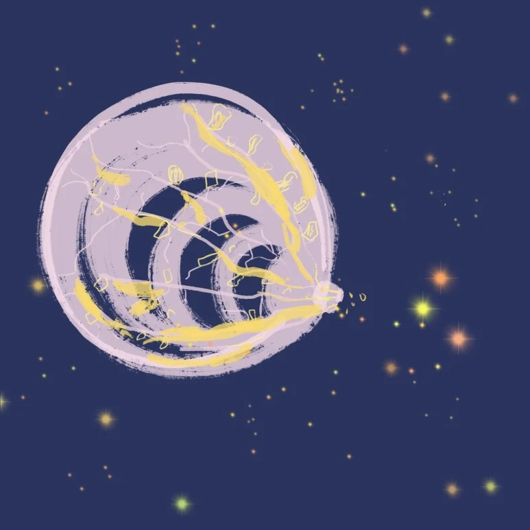 ②작품 설명 : 모유수유의 신비로움을 우주와 별에 빗대어 표현한 그림. 유두에서 나오는 대여섯 갈래의 젖 줄기는 은하수요, 젖방울은 하나 하나의 별이다.