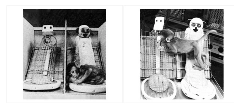 1958년, Harry F. Harlow도 똑같은 질문을 했다. 그리고 가설울 세운다. 엄마를 좋아하는 이유는 아기에게 먹을 것(젖)을 주기 때문일 것이다.