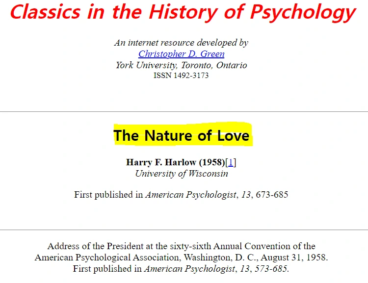 널리 알려진 '헝겊엄마, 철사엄마' 실험으로 초기 가설은 기각되고 사랑의 본질은 접촉 위안(Contact comfort)이라는 것을 밝혀낸다. 내가 원서를 찾아 읽어볼 정도로 사랑하는 논문 「The nature of love」이다.