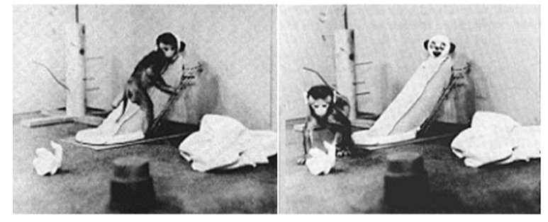 헝겊 엄마와 함께 지낸 원숭이는 공포를 느꼈을 때 곧장 엄마에게 달려가 안긴다. 안정을 취한 뒤 정상화 된다. 철사 엄마와 함께 지낸 원숭이는 공포 자극을 받아도 엄마에게 도망가 안기지 않는다. 우왕좌왕하다 이상행동을 보인다.