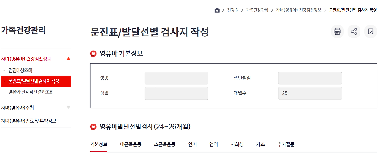 K-DST는 생후 4개월부터 71개월 이내의 자녀의 발달을 체크해 볼 수 있는 문항을 제공하고 있다. 25개월인 춘이의 경우 검사일 기준 ±1~2개월 구간에 해당하는 검사지(24~26개월)를 다운로드했다.