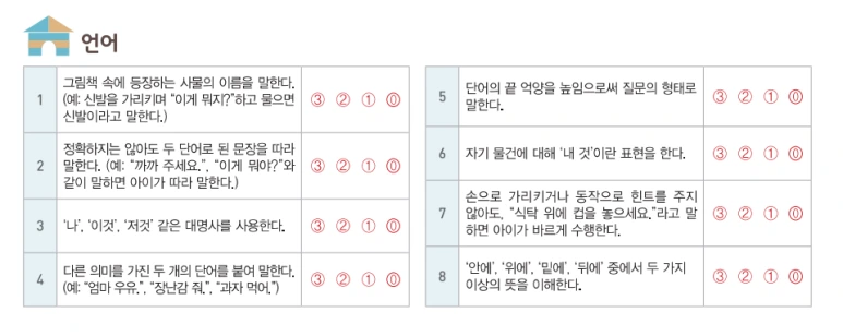 춘이는 제시된 8문항에서 요구하는 언어표현을 할 수 있나? 춘이가 정상적인 언어발달의 과정을 거치고 있다는 판단이 서자 안심이 됐다.