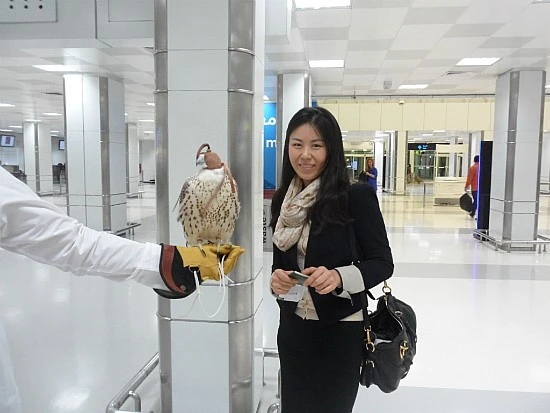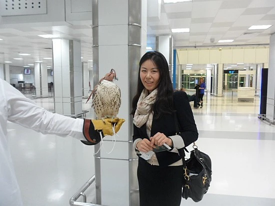 공항 내부로 들어가려는데, 저 멀리서 팔콘을 손에 쥔 카타르 두 명이 다가옵니다. 하얀 디쉬다쉬를 차려입은 사람이 눈을 가린 매를 정성스레 데리고 오는 모습을 보니 신기한지, 한 여자 여행객도 눈이 커지네요! 기내에서 본 적이 있고, 와키프 쑥에서도 팔콘을 본 적이 있지만, 공항에서 본 기념이니 그냥 지나갈 수 없습니다.