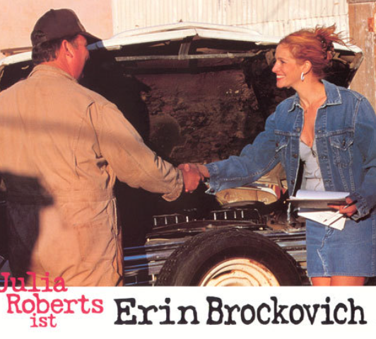 영화 처음 식당에서 서빙을 보던 실제 에린 브로코비치의 모습과 줄리아 로버츠 뒤에서 신문을 보며 식사를 하는 변호사 에드의 모습은 영화를 보는 또 다른 묘미를 선사하는 이 영화는 전형적인 미국판 해피엔딩으로 끝이 납니다. 배상금으로 3억 3백만 달러(한화 약 4천억 원)이라는 어마 어마한 액수를 받아내고 에린도 수백만 달러의 보너스를 받습니다. 그러나 실제 인물이 등장할 정도로 멋진 성공스토리를 담고 있는 에린 브로코비치를 그저 즐겁게만 볼 수 없는 것은 650명이 소송에 서명을 했다는 사실, 즉 피해자가 어마 어마하게 많았다는 것과 PG&G에서 기술직으로 일하다 내장이 다 녹아 죽었다는 이야기, 암에 걸려 고생하는 아이의 모습을 성공스토리 만으로 그냥 넘길 수는 없습니다. 어마 어마한 금액으로 이겼다는 것도 인간의 생명과는 바꿀 수 없는 것입니다. 우리는 사람의 생명이 돈으로 환산되는 무시 무시한 논리 속에서 살고 있는 것은 아닌가? 를 다시 한번 돌아보게 합니다.