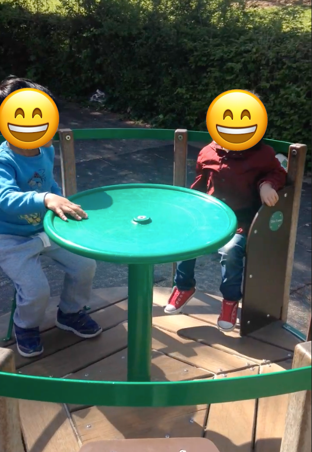 그러자 딸은 씩씩하게 다시 말한다. "네가 돌린다고? 알았어 그럼 네가 돌려!" 그러고서는 자리에 앉는다. 남자아이가 힘껏 돌리기 시작하자 속도가 꽤 빨라진다. 그러나 딸은 "아니! 그렇게 돌리면 내가 어지럽잖아. 살살 돌려줘!"라고 말한다.