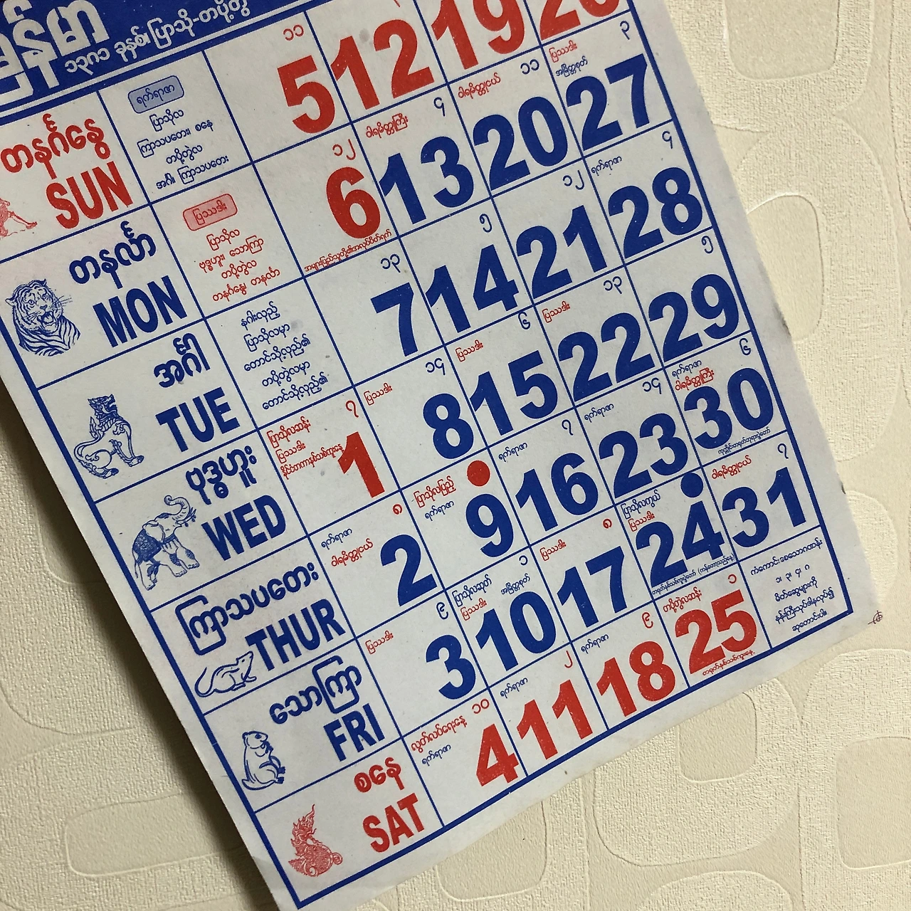 미얀마에서 언어의 장벽을 느낀 적은 없다. 어느 곳이나 영어가 너무 잘 통했기 때문이다. 그저 곳곳에 적혀있는 미얀마어를 마치 그림같이 생겨서 눈길이 갔다. 우연히 음식점에서 벽에 걸려있는 달력을 보았다. 보통 우리나라 식당에 있는 달력엔 맨 윗 라인에 요일이 적혀있고, 그 밑으로 날짜가 적혀있다. 그런데 거기서 본 건 요일은 왼쪽에 쭉 쓰여있고, 그 오른쪽에 날짜가 세로로 쓰여있었다. 요일 옆엔 동물 그림도 그려져 있고, 아무튼 귀여웠다. 미얀마 글씨 자체도 동글동글해서 달력 자체가 귀여웠다. 언젠가 기회가 되면 미얀마어로 요일 읽는 법 정도는 배워보고 싶다. 동글동글한 글자만큼이나 발음도 마음에 들 것 같은 느낌이다. 그렇게 달력이 탐난다고 생각했는데, 길거리에서 달력을 팔길래 냉큼 하나 샀다. 일력을 살까 고민했는데, 계속 들고 다니는 게 일일 것 같아 얇은 달력을 하나씩 샀다. 집에 와서 벽에 한 장 붙여놓으니 괜히 기분이 좋았다. 물론 지금 20년도 달력이 2장밖에 안 남았다는 게 믿기지 않지만. 찢긴 달력 한 장이 내가 미얀마에 다녀왔음을 항상 느끼게 해주고 있다.