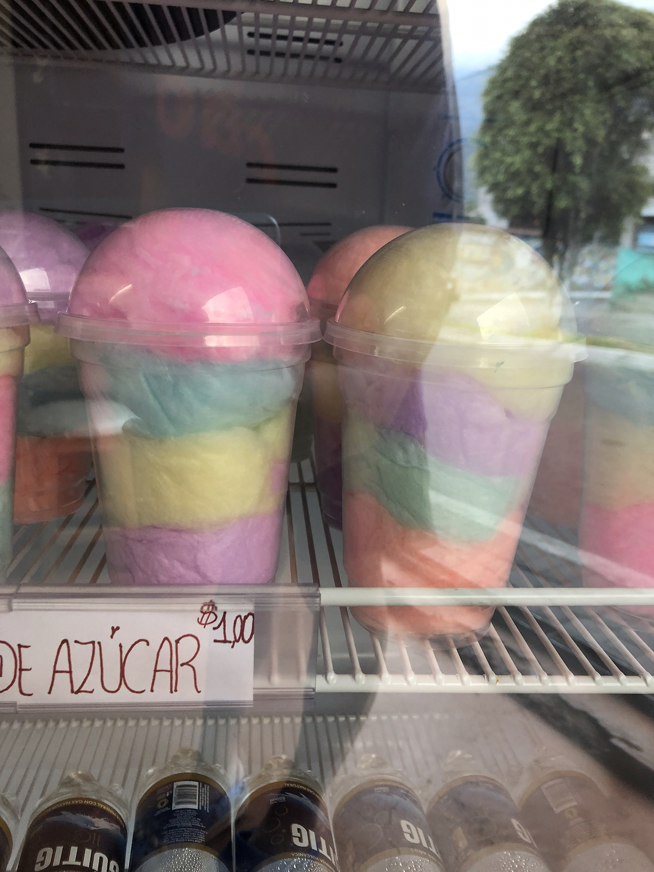 바뇨스에서 카혼을 체험했다. 쉽게 말하면 우리나라 사우나랑 비슷한 건데, 따뜻한 증기를 한참 쐬다가 찬 물을 한바탕 끼얹는 과정을 3번 정도 반복하는 온천체험이다. 맨 처음엔 찬 물을 한 바가지 쏟으니까 당황했는데, 몸이 노곤노곤해지면서 가벼워지는 게 느껴졌다. 나른한 몸을 이끌고 숙소로 돌아가는 길, 아이스크림을 하나씩 먹기로 했다. 아이스크림 맛을 고르고 기다리는데, 옆에 보이는 솜사탕. 색이 예뻐서 찍었는데, 동시에 색소를 얼마나 넣은 걸까? 하는 생각도 들었다. 역시나 이번에도 아이스크림 사진은 없고, 무지개색 솜사탕만 사진첩에 남아있다.