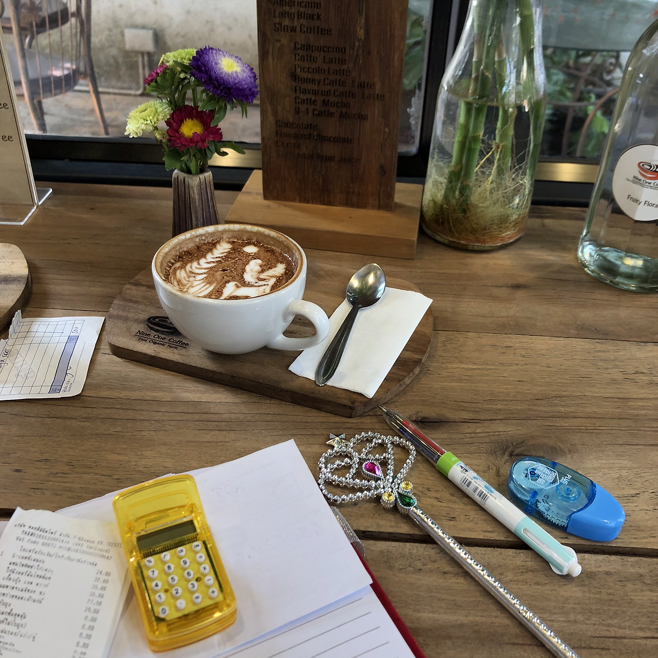 치앙마이에서는 더워서 카페를 자주 갔다. 분위기 좋은 카페가 많은 것도 한 몫했다. 숙소 근처에 바리스타 대회에서 1등 한 곳이 있다길래 가봤다. 음.. 커피는 기억이 안 나지만, 공간이 너무 예뻤다. 다들 노트북을 들고 나와 할 일을 하는 그런 분위기였다. 확실히 치앙마이는 디지털 노마드를 위한 도시였다. 조용하고, 일하기 좋은 공간들이 많았고, 코워킹 서비스도 굉장히 잘 되어있었다. 일하는 사람들 틈에 껴 우리도 일을 했다. 쌓인 돈 정리도 하고, 입장표나 영수증을 붙였다. 한참 열심히 쓰다가 찍은 사진이 왼쪽 사진이다. 사실 사진에 있는 노란색 계산기는 잘 안된다. 출국 전에 왼쪽 사진에 있는 계산기와 공주펜, 오른쪽에 있는 빨간 노트를 샀다. 셋의 조합이 예쁘다고 생각해서 사간 건데, 노트 말고는 그저 예뻐서 들고 다녔던 물건 중 하나다 (심지어 곧 계산기는 깨져버린다) 치앙마이에서는 여행보다는 쉼을 선택해서 그런지 일기에 쓰여있는 것이 많지는 않다. 그래도 그 날 뭘 먹었는지는 꼭 적혀있다.