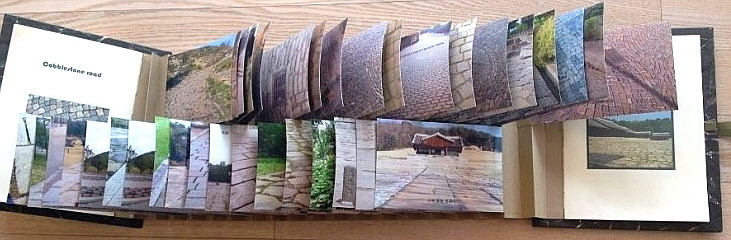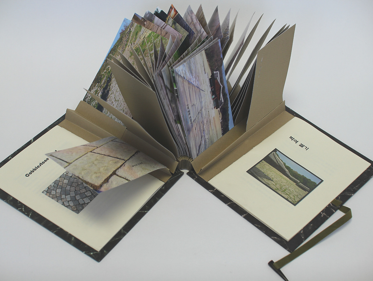 박석깔기는 왼쪽에 붙일 것이므로 왼쪽에서부터 페이지가 시작되고, 코블스톤 길은 오른쪽에서부터 페이지가 시작되도록 편집했다. 사진은 직접 방문한 장소에서 찍은 것들이다.