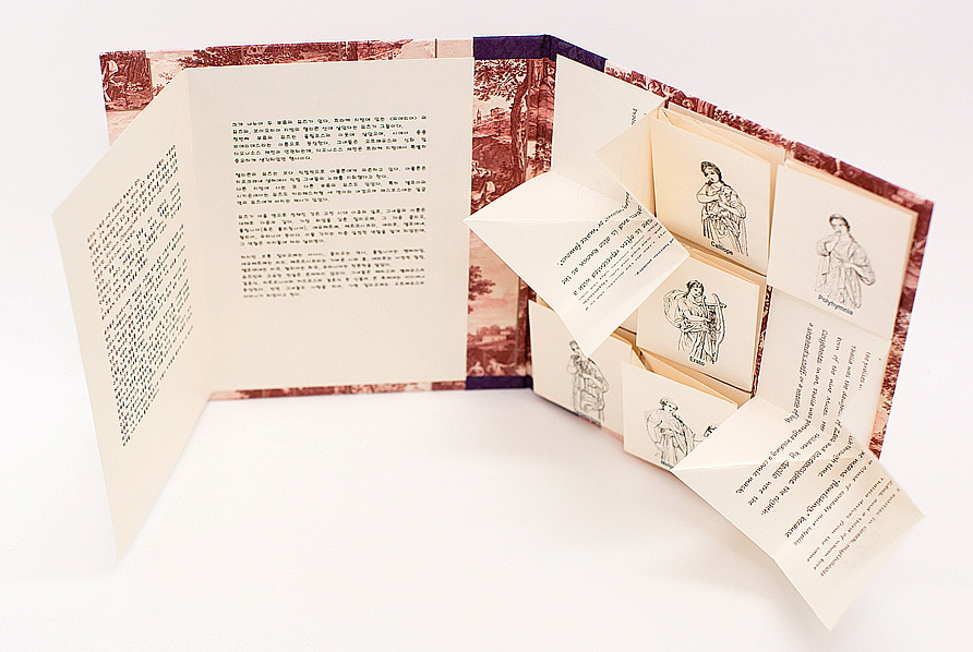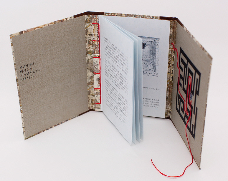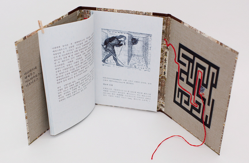 이 책은 신화의 내용을 프린트하여 동양식 바인딩으로 묶었다. 그것을 표지에 붙였고, 뒷표지 안쪽에는 미로를 그려넣었다. 상진인 실과 황소가 미로 속에 있다.