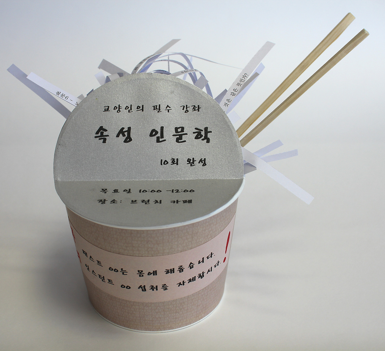 그들의 위대한 사유를 프린트한 후에 한 행 씩 잘라서 국수가닥을 연출했다. 플라톤의 이데아론, "나는 생각한다 고로 존재한다"는 데카르트의 방법서설, 칸트의 미학과 근대 인식론, 현대 철학의 근간을 이룬 니체.... 한 철학자에게 접근하고 그의 사상을 배우고 익히기까지 여러 해가 걸릴 거대한 사유들이 한낱 국수가닥처럼 서로 엉켜서 일회용기 속에 들어있다.