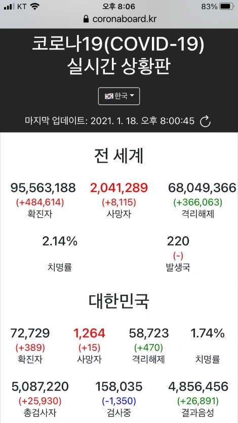 요즘 우리 국민이, 아니 전 세계 사람들의 관심이 집중된 수치가 있다. 코비드 19 펜데믹 시대를 살고있는 지구촌의 모든 사람들이 이 숫자에 매어있다. 수시로 재난경보가 울리는 전화기를 끼고 살면서 마치 전시의 공습경보같은 느낌이다. 맞다. 전시, 전쟁중이다. 만만치 않은 상대와 싸우고 있다. 언제쯤이면 이 숫자판을 안 들여다봐도 될는지...