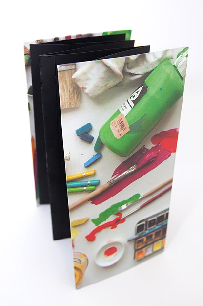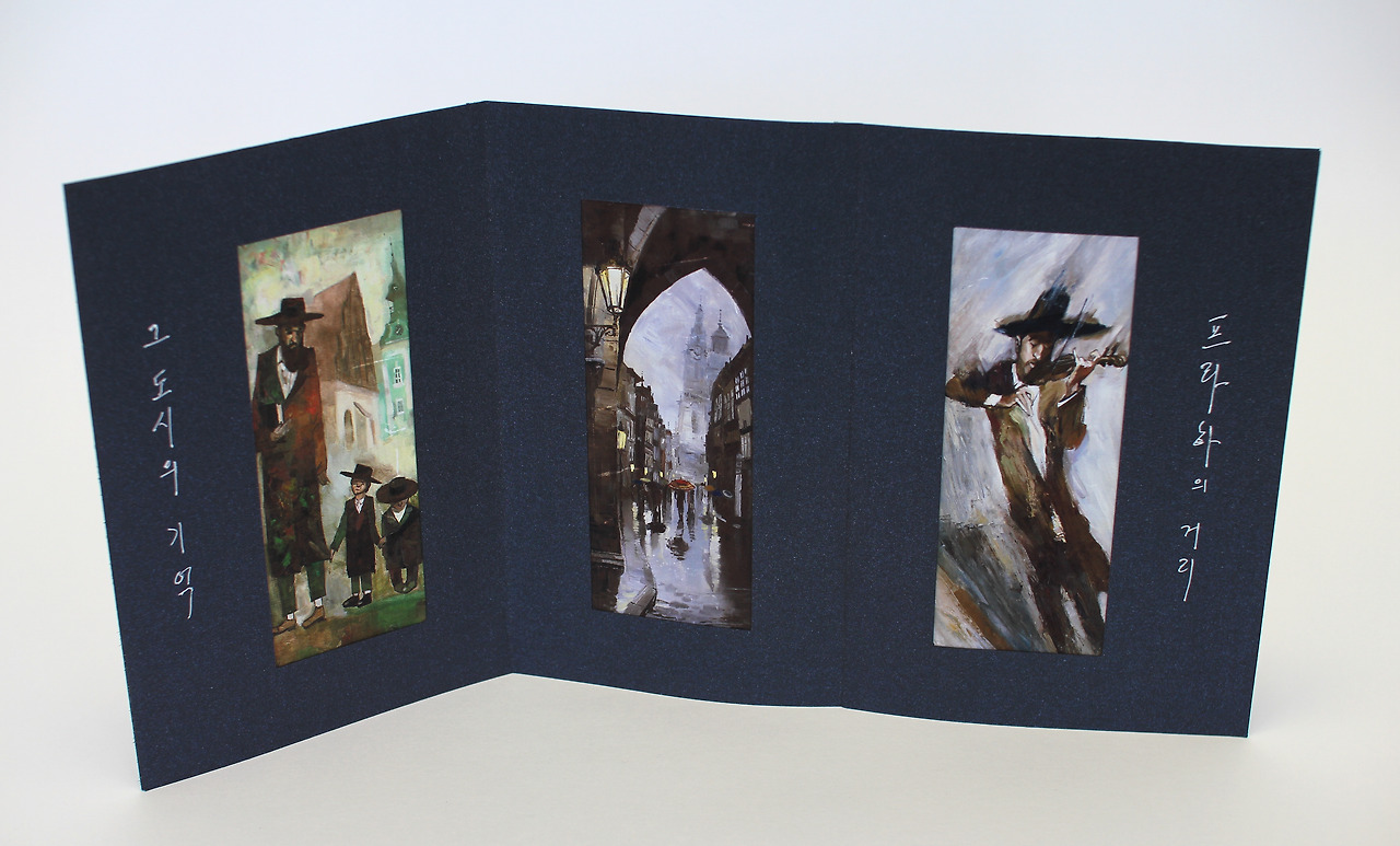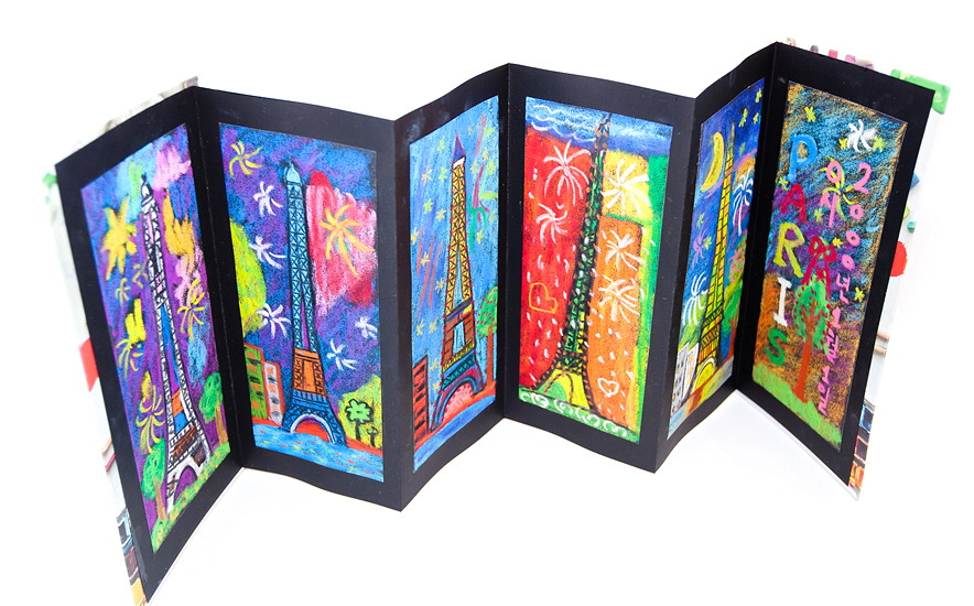 그림은 샌드 페이퍼에 크레파스로 그리고 픽사티브로 마감했다. 색감을 살리기 위해 바탕은 블랙 종이. 화려함을 느끼도록 오픈 아코디언북으로 만들었다.