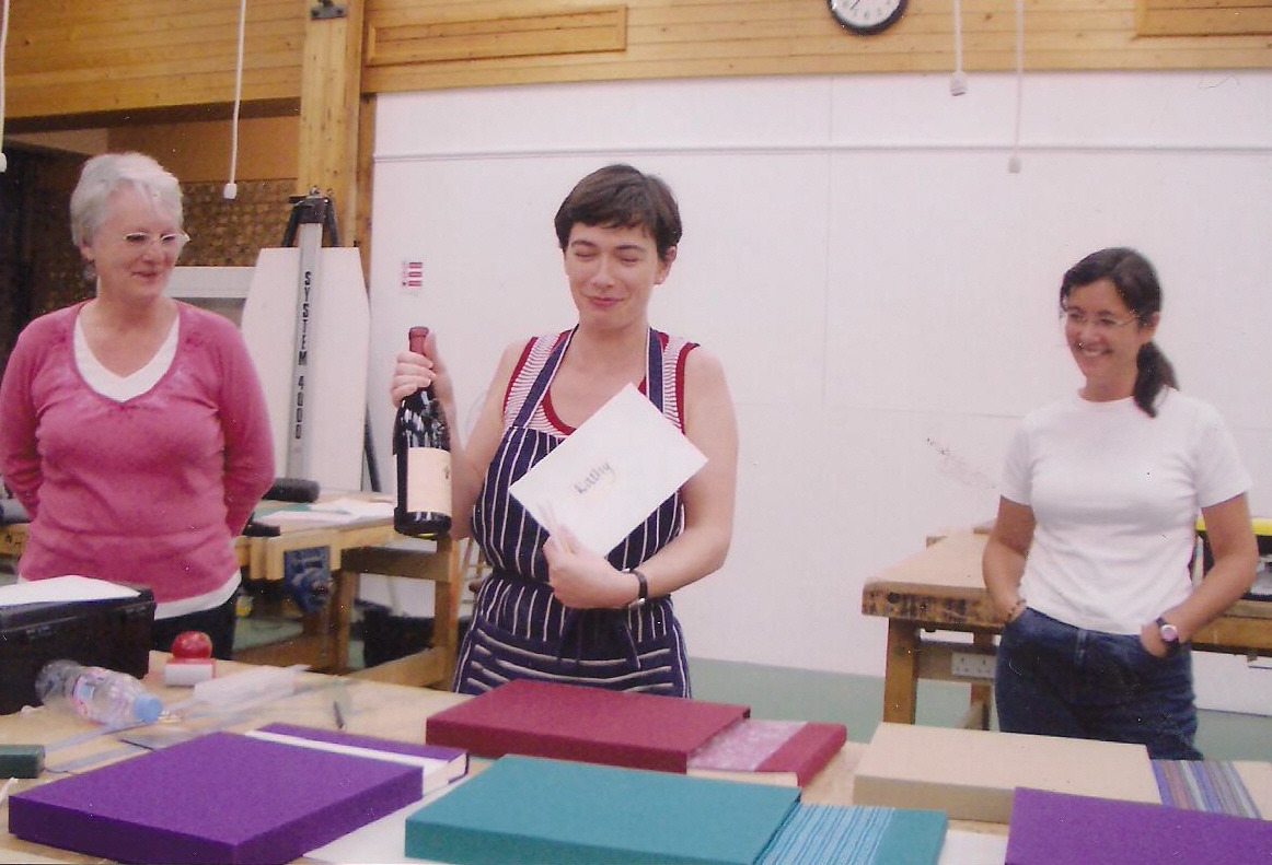Abbott Kathy 선생. 그에게서 나는 0.5mm의 중요성과, 1mm도 안되는 종이 한 장의 두께가 얼마나 중요한지 배웠고, 책을 만들 때나 상자를 만들 때나 종이 재단할 때는 늘 그것을 염두에 두고있다. 끝나는 날 수강생이 선물한 와인을 받고 좋아하는 모습.