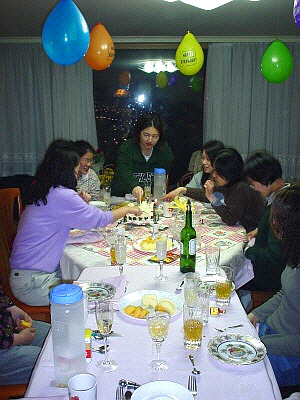 맛있는 것을 먹을 때의 모습은 참 행복해 보인다. 백열등의 촛불모양 식당전등도 분위기를 잡는데 한 몫 한다. 식탁에 올려진 것이 푸짐한 것도 아니고, 달랑 큰 접시 하나(빨간 피망에 노란 단무지까지 껴서 색깔은 화려하다), 김그릇, 그리고 각자의 밥그릇과 물컵 뿐인데 아이들은 별미를 먹는 맛에 신이 났고 모두들 행복해 보인다. 아, 참, 마당에서 꺾어다놓은 동백꽃 세 송이도 식탁을 빛낸다.