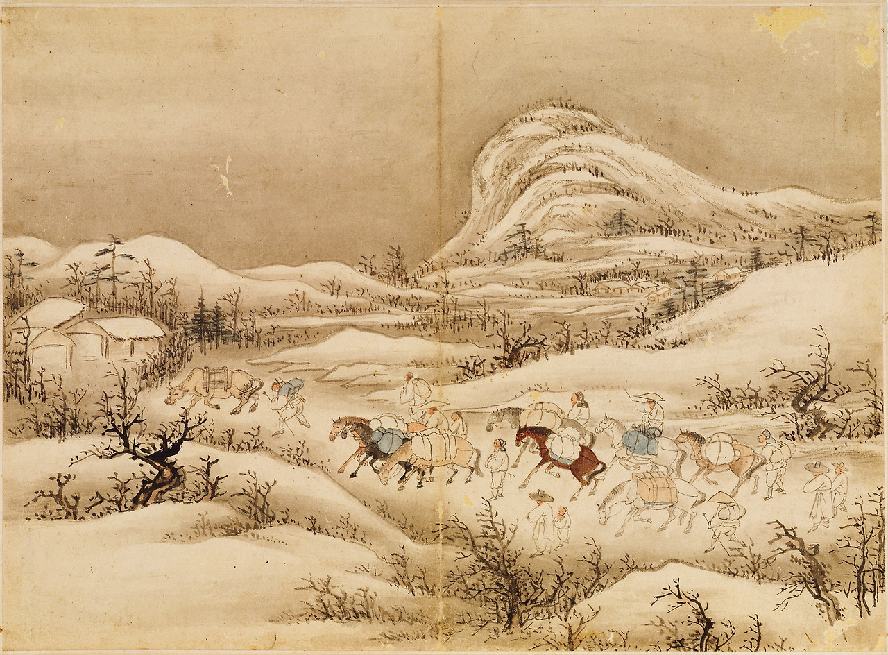 말과 소를 앞세운 긴 행렬이 나무로 된 다리를 건너고 있다. 다리를 떠받치고 있는 나무 기둥을 짙은 먹으로 칠해 다리의 안정감을 더해준다. 사람들은 두 세 명씩 몰려있는데 앞선 두 남자는 소와 말을 몰고 아이를 데리고 간다. 다음 세 남자는 등짐을 졌다.