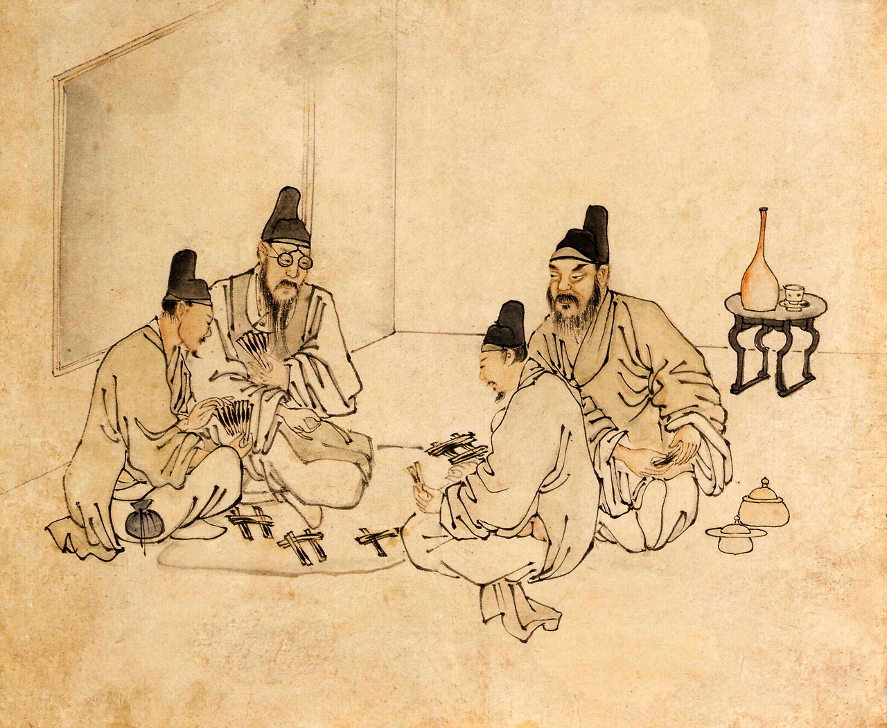 우리 옛 그림은 오른쪽 위에서부터 왼쪽 아래 방향으로 본다. 그렇게 보면 맨 먼저 보이는 것은 개다리소반이다. 도박판의 술상인 듯하지만 무관심하게 멀찌감치 밀어놓은 것하며 잔이 하나뿐인 것을 보면 저 병은 술병이 아니라 물병인 것 같다. 잔탁을 보면 물이 아니라 술인 것도 같고. 가래를 뱉는 타구와 요강까지 준비하고 시작한 도박판이다. 아마도 밤을 새운 모양이다.