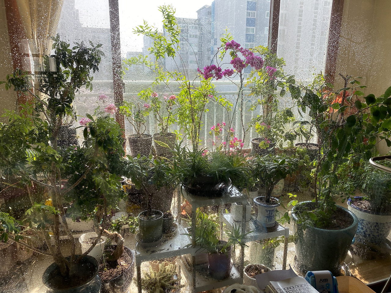 기온이 20도를 넘기면서 베란다 식물들을 샤워시키기 시작했다. 거실 큰 유리창도 바깥 유리창도 원없이 물청소를 했다. 나는 나무마루가 깔린 거실에서, 마루를 깔고 잘 가꾼 베란다에서 식물을 키우지 못한다. 얼마나 부지런하면 얘네들 잎을 다 닦아준단 말인가. 식물들에게 가장 좋은 것은 햇빛 바람 물, 그런데 비보다 더 좋은 물은 없고, 물샤워보다 더 좋은 물주기는 없다는 것이 나의 지론이다.